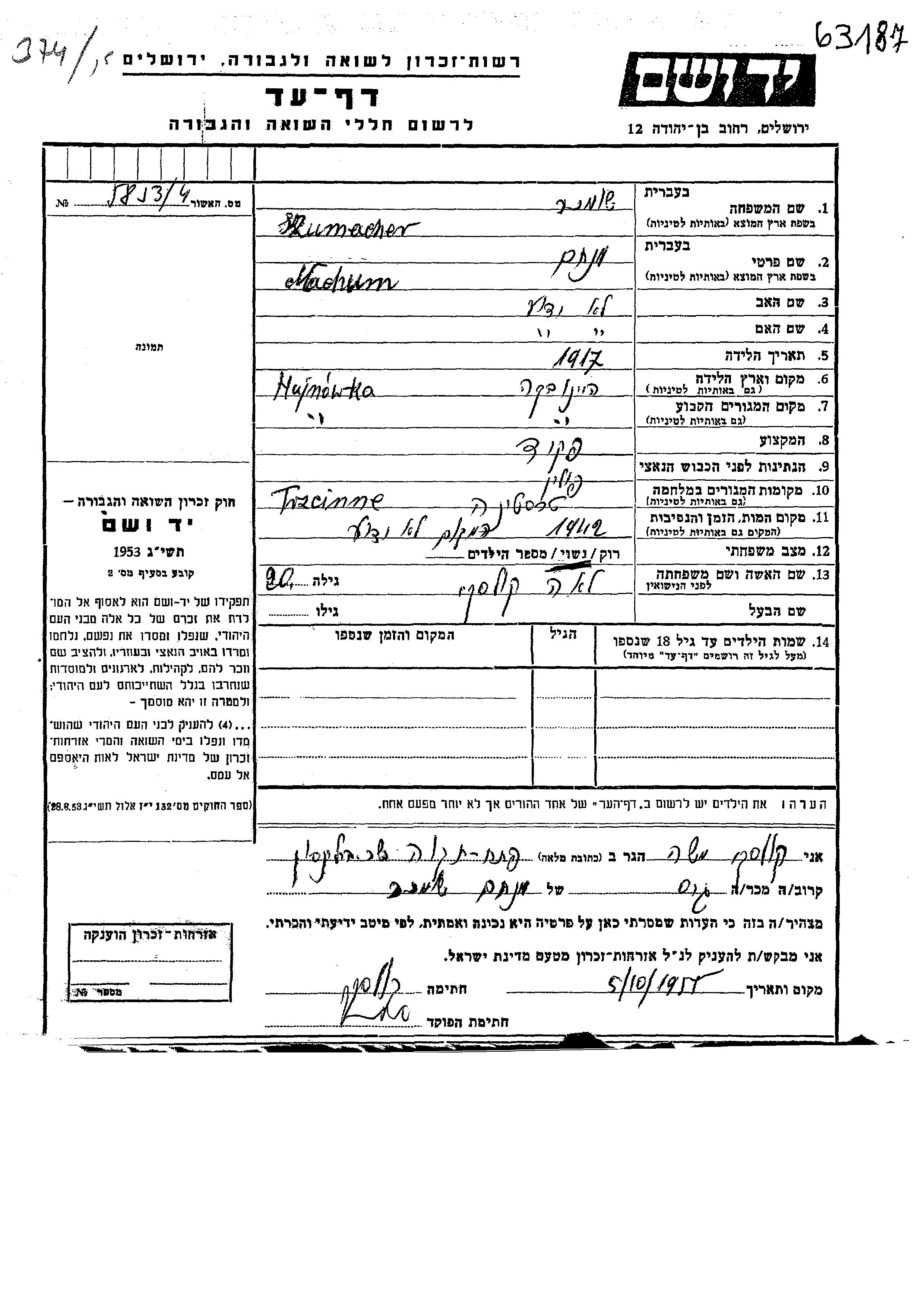 Mnaham Szumacher was born in Hajnówka, Poland, 1917. He was a clerk and married to Lea nee Kulski. Prior to WWII he lived in Hajnówka, Poland. During the war he was in Trzcianne, Poland. Mnaham was murdered in the Shoah. Place of death: unknown, 1942.