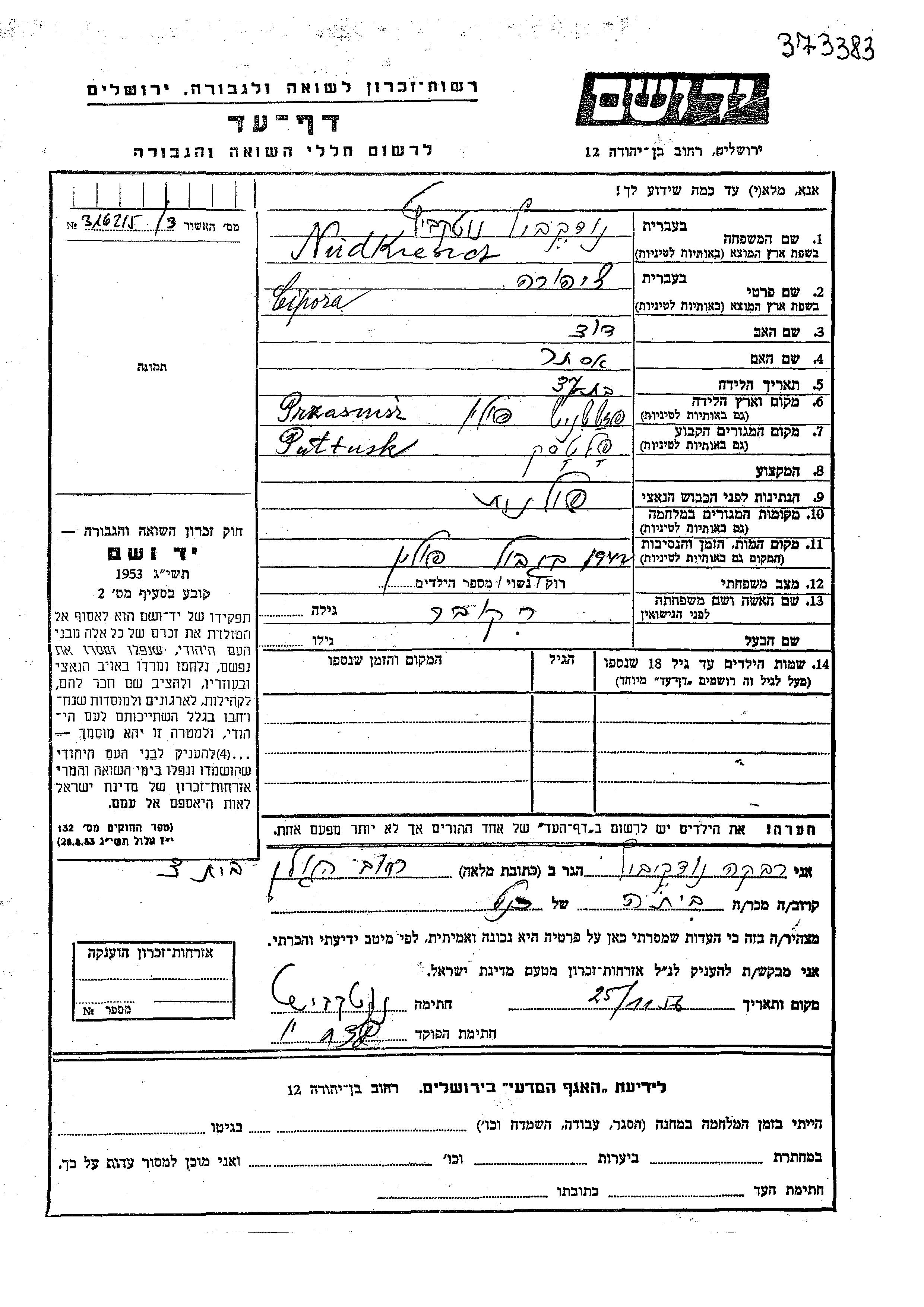 Cipora Nudkiewicz nee Kober was born in Przasnysz, Poland to David and Ester. She was married. Prior to WWII she lived in Pultusk, Poland. Cipora was murdered in the Shoah. Place of death: Poland, 1942.