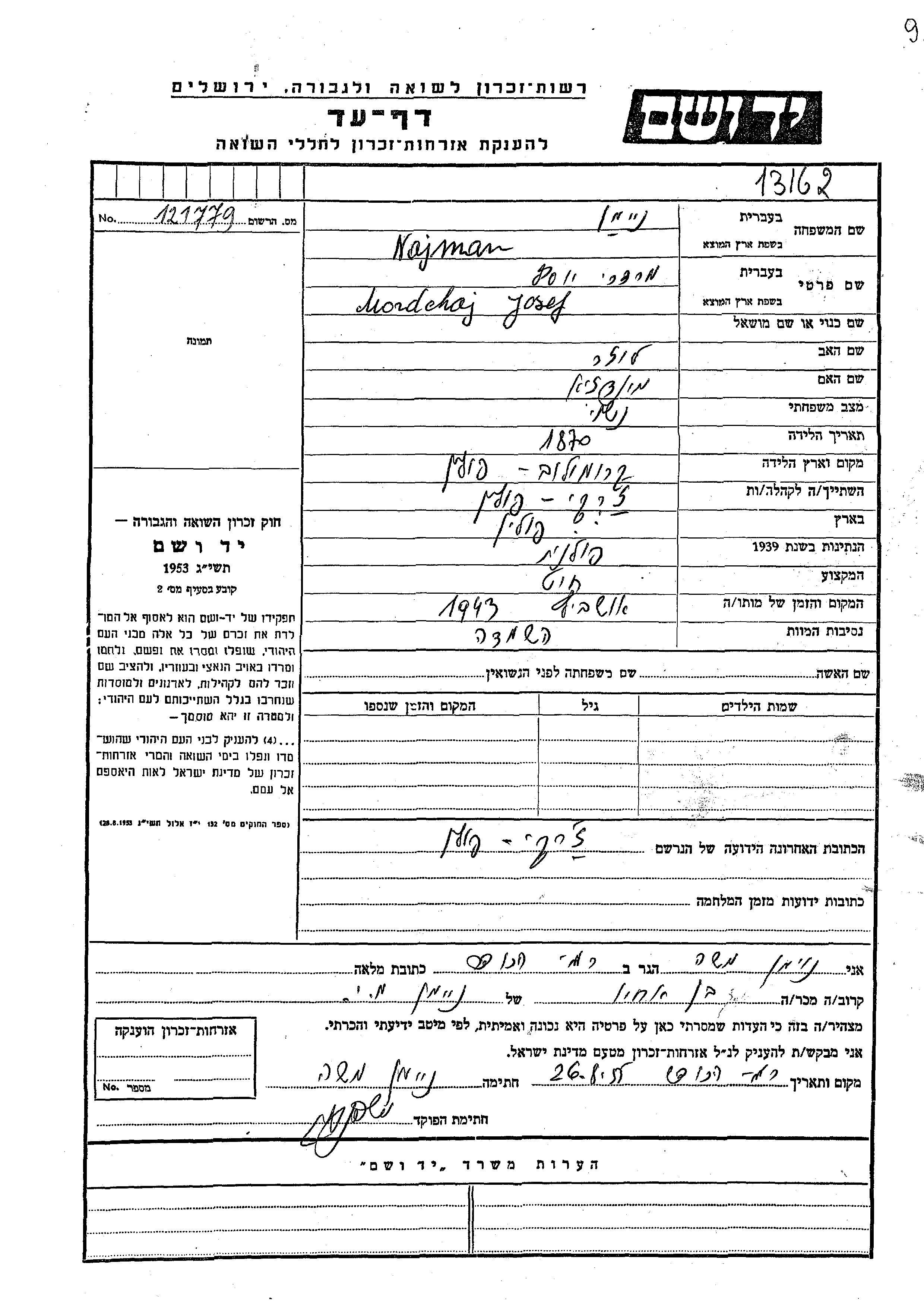 Mordchaj Josef Najman was born in Kromolow, Poland, 1870 to Luzer and Mondzia. He was a tailor and married. Prior to WWII he lived in Zarki, Poland. Mordchaj Josef was murdered in the Shoah. Place of death: Auschwitz, Poland, 1943.