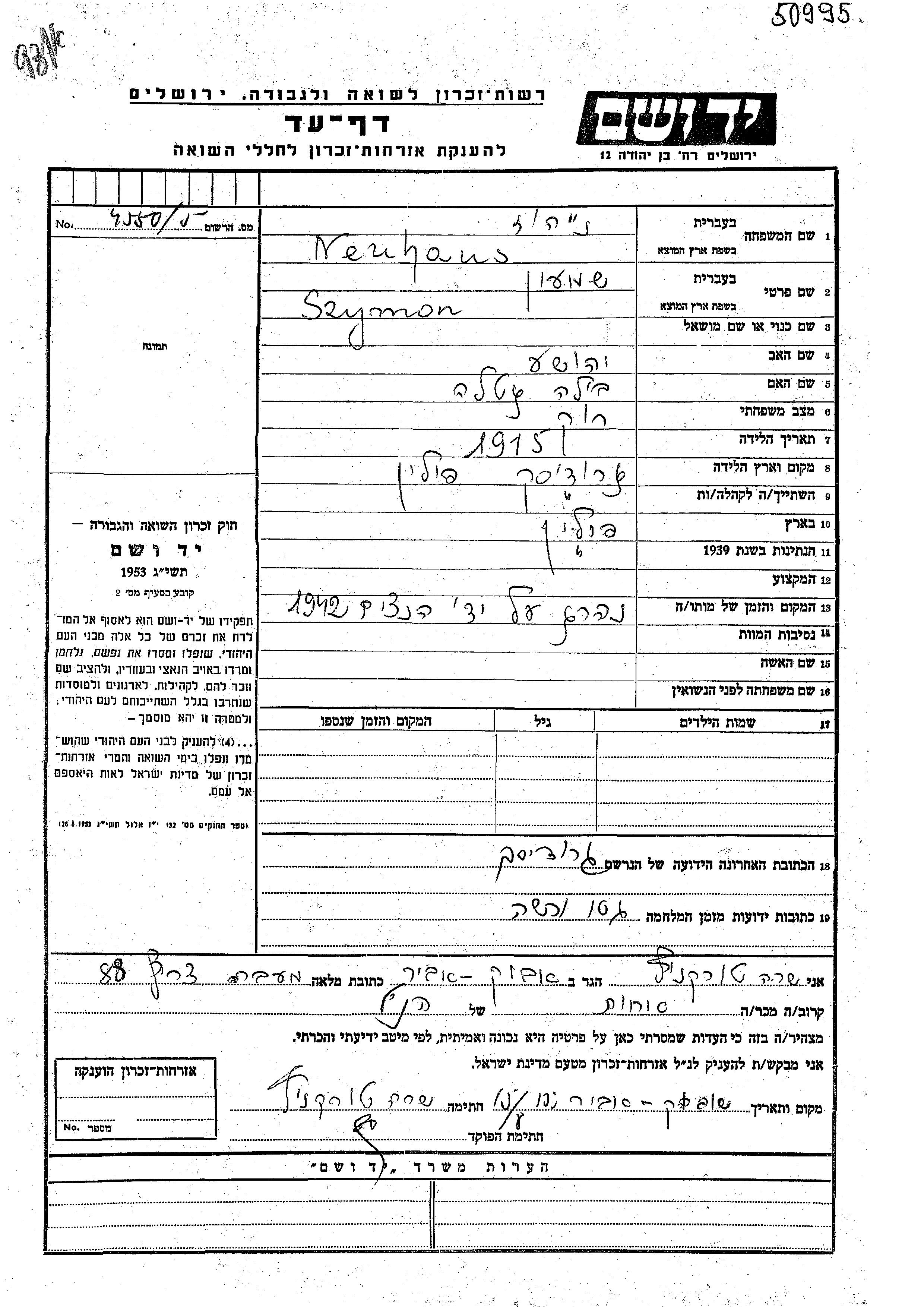 Szymon Neuhaus was born in Grodzisk Mazowiecki, Poland, 1915 to Yehoshua and Bila Gitla. He was single. Prior to WWII he lived in Grodzisk Mazowiecki, Poland. During the war he was in Warsaw, Poland. Szymon was murdered in the Shoah. Place of death: unknown, 1942.