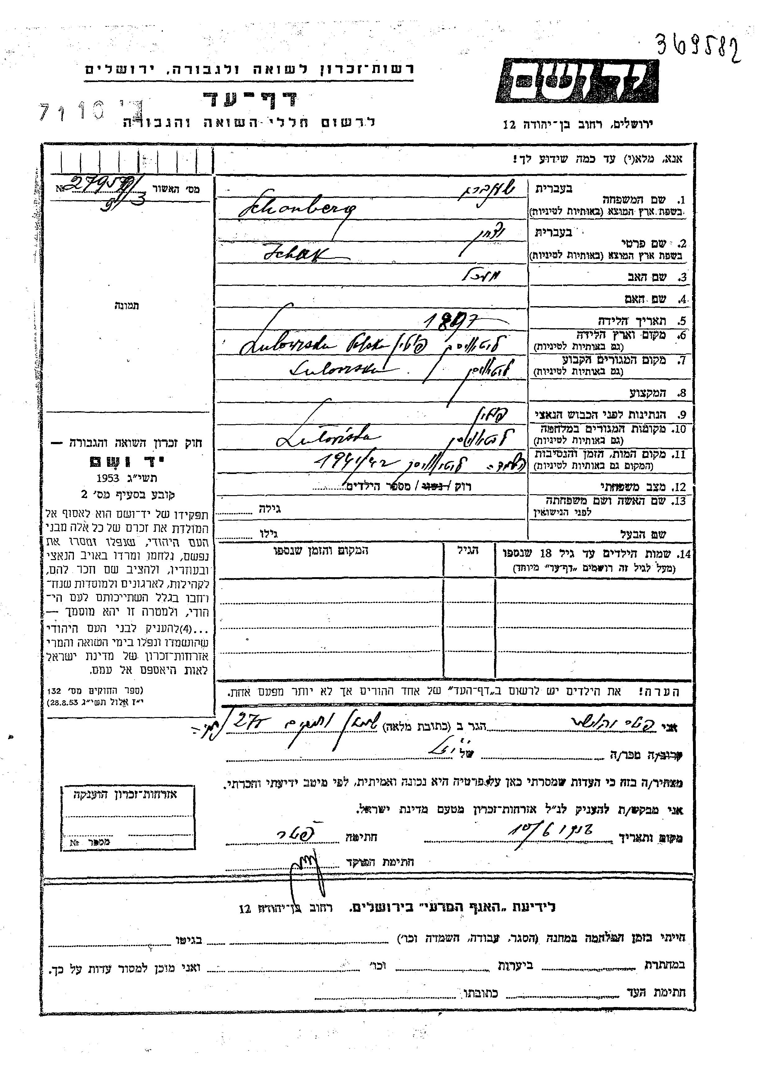 Ichak Schonberg was born in Lutowiska, Poland, 1897 to Mekhl. He was single. Prior to WWII he lived in Lutowiska, Poland. During the war he was in Lutowiska, Poland. Ichak was murdered in the Shoah. Place of death: Lutowiska, Poland, 1941.