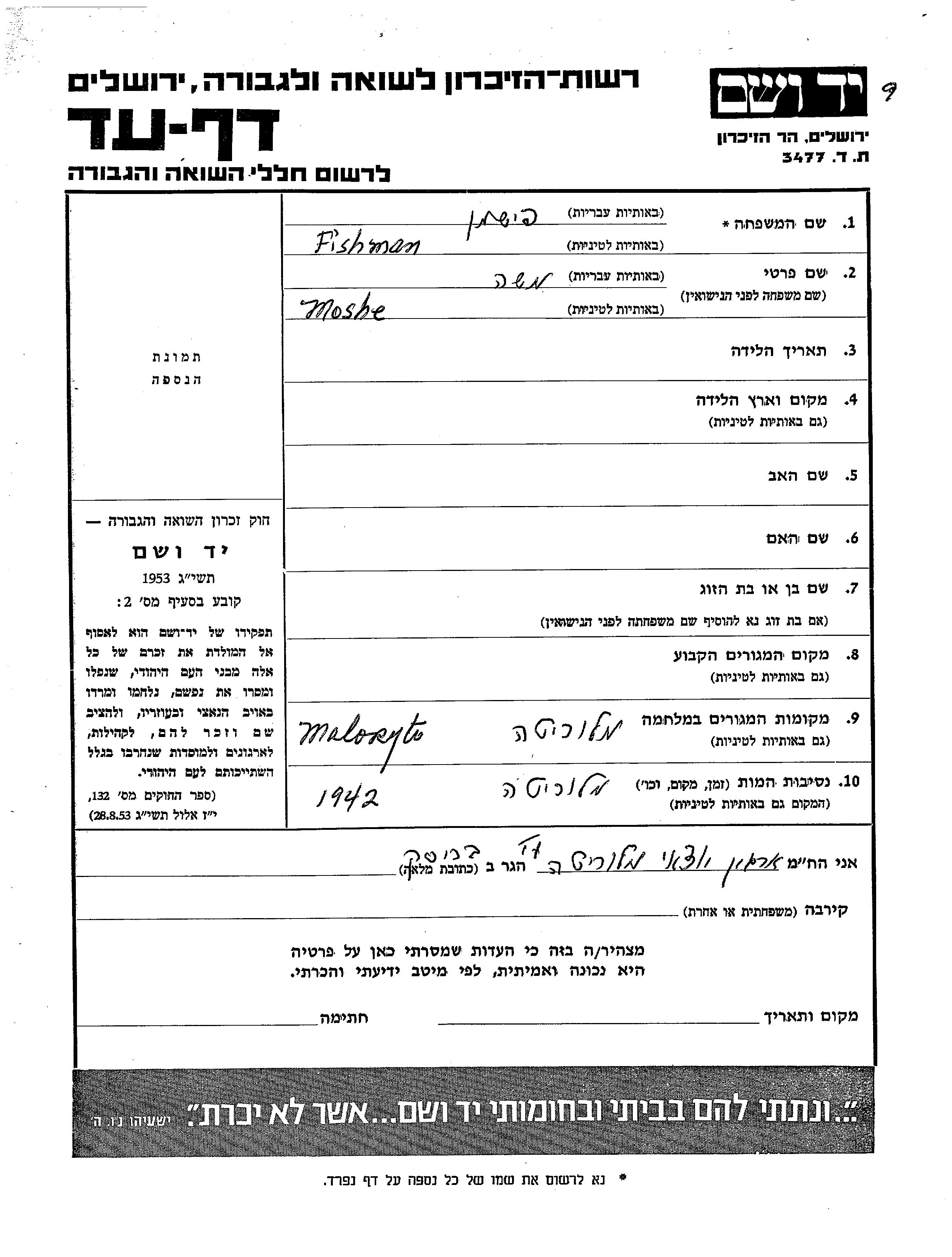 Moshe Fishman. During the war he was in Maloryta, Poland.