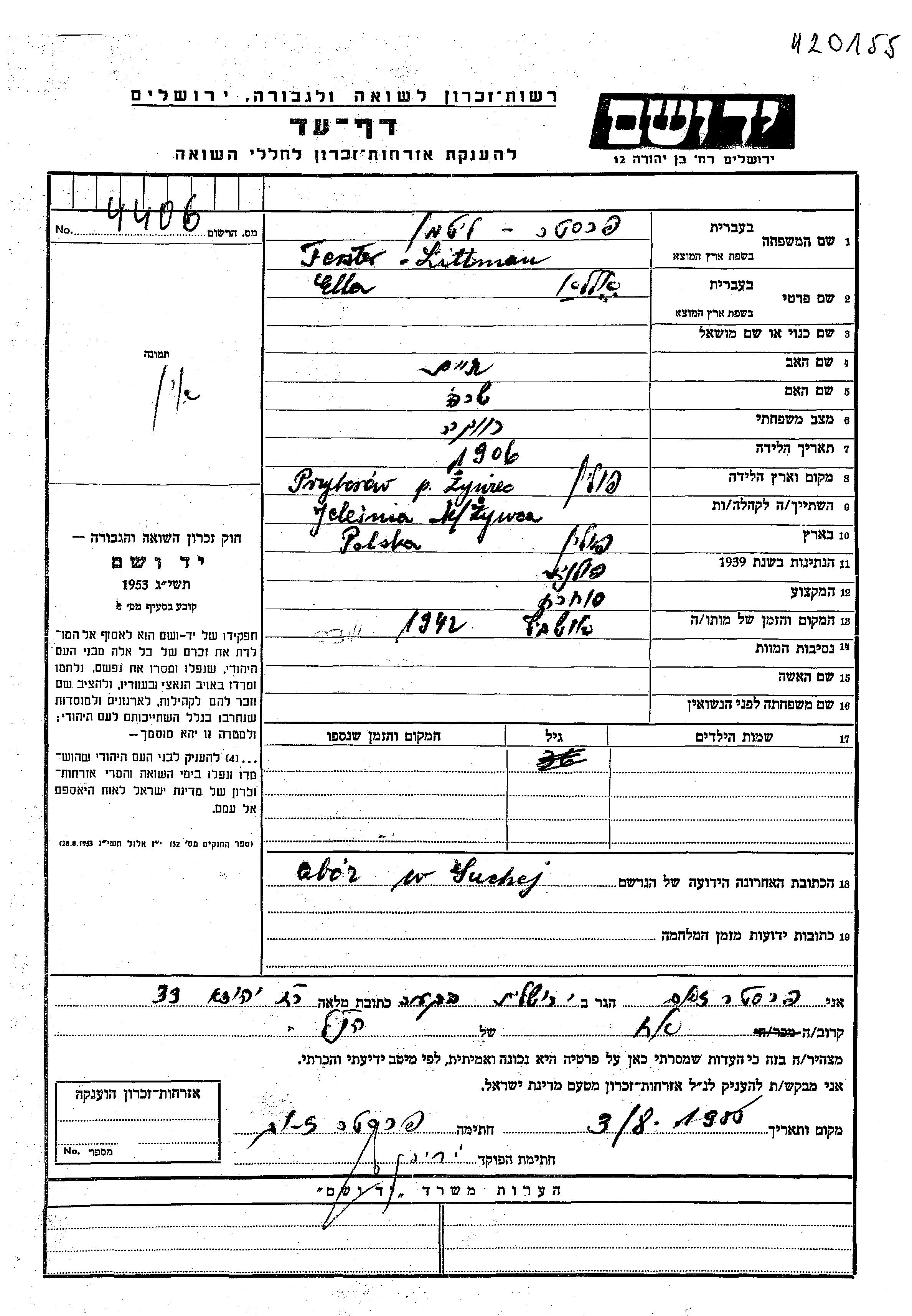 Ella Littman Ferster was born in Przyborow, Poland, 1906 to Khaim and Sara. She was a merchant and single. Prior to WWII she lived in Jelesnia, Poland. During the war she was in Sucha, Germany. Ella was murdered in the Shoah. Place of death: Auschwitz, Poland, 1942.