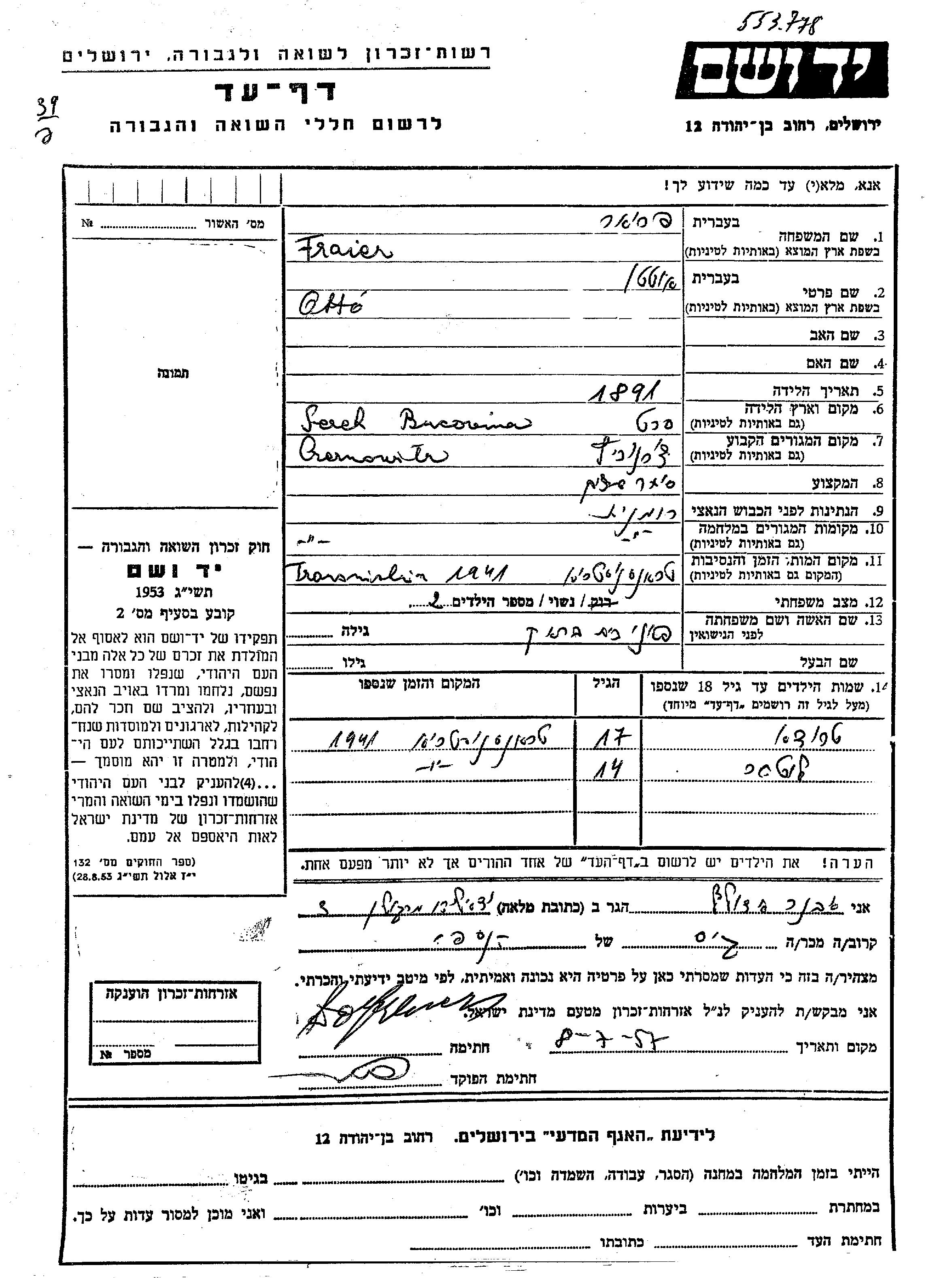 Fraier Otto 1891 Chernovitsy, Romania Page of Testimony