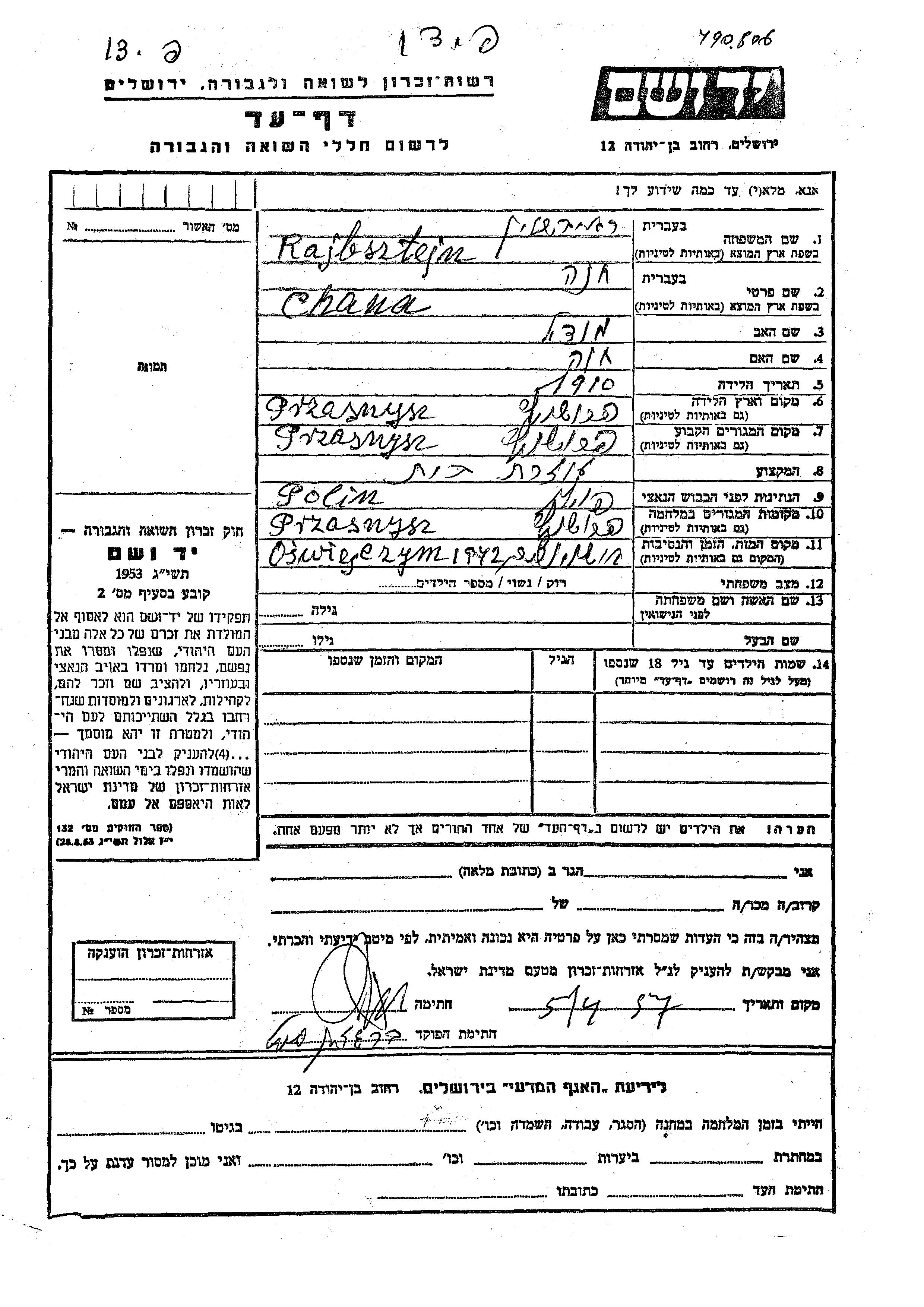 Chana Rajbsztejn was born in Przasnysz, Poland, 1910 to Mendil and Khava Khaia. She was a housewife. Prior to WWII she lived in Przasnysz, Poland. During the war she was in Przasnysz, Poland. Chana was murdered in the Shoah. Place of death: Auschwitz, Poland, 1942.