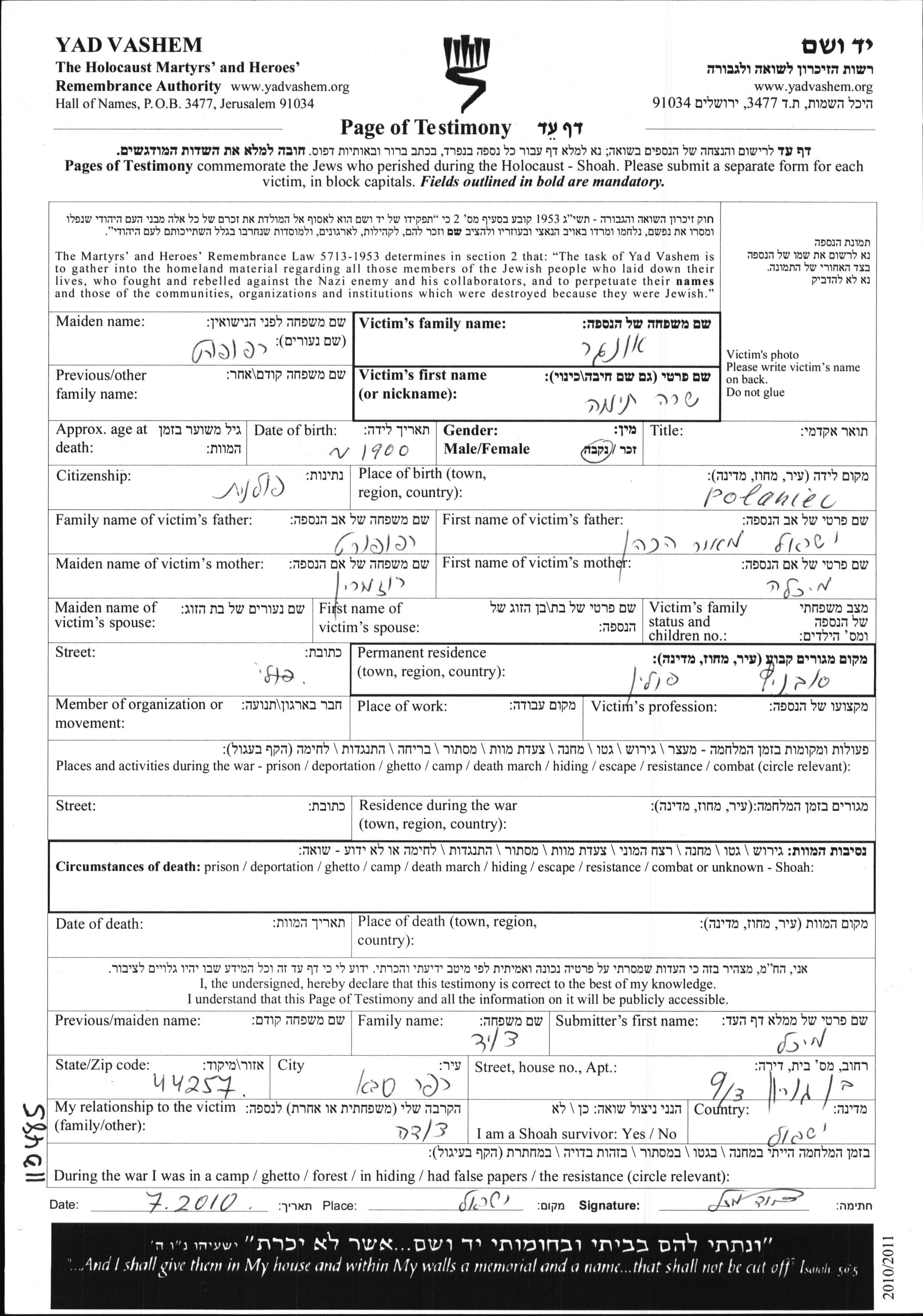 Sara Tima Unger nee Rapoport was born in Polaniec, Poland, 1900 to Yisrael Meir and Mikhla nee Rozmarin. Prior to WWII she lived in Stopnica, Poland. Sara Tima was murdered in the Shoah.
