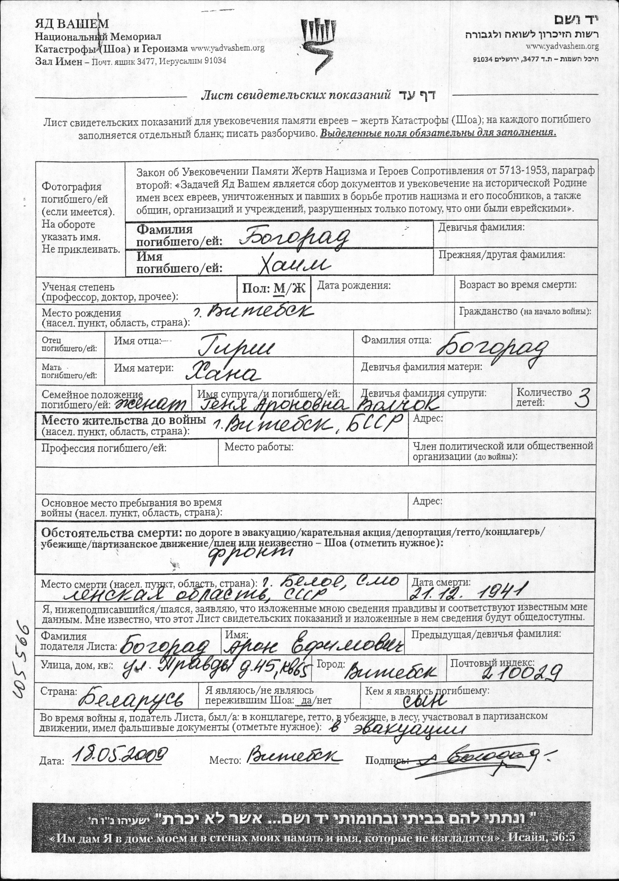 Khaim Bogorad was born in Yurovichi, Belorussia (USSR) to Girsh and Khana. He was married to Genya nee Volchok. Prior to WWII he lived in Yurovichi, Belorussia (USSR). During the war he was in the Soviet armed forces. Khaim was killed in military service in WWII. Place of death: Beloye, Russia (USSR), 21/12/1941.