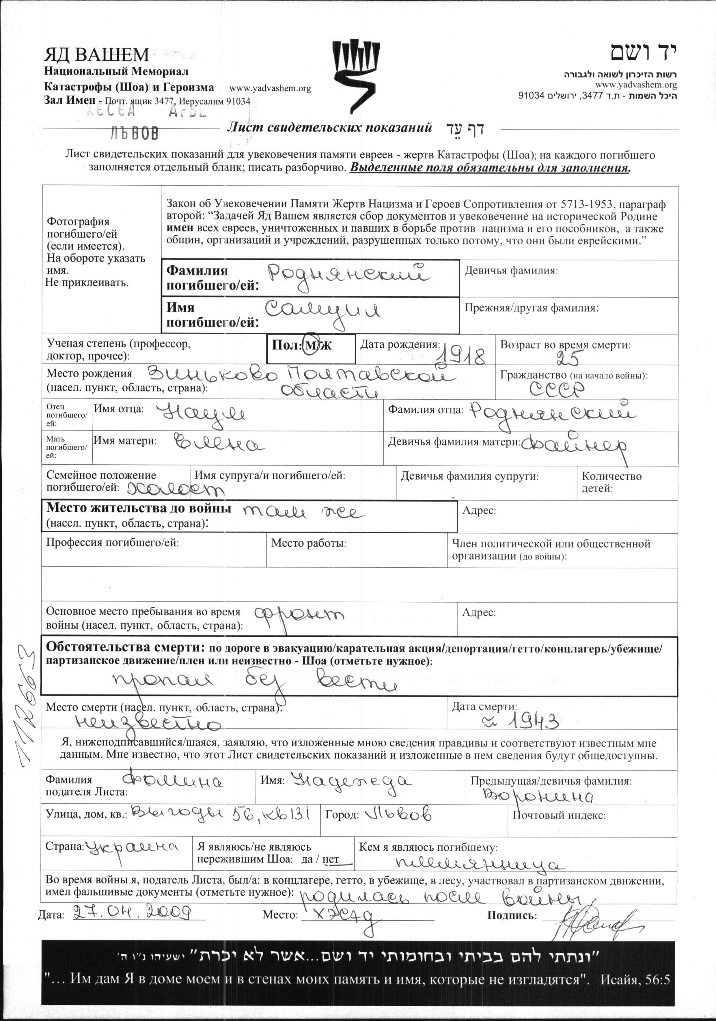 Samuil Rodnyanski was born in Zinkov, Ukraine (USSR), 1918 to Naum and Yelena nee Fayner. He was single. Prior to WWII he lived in Zinkov, Ukraine (USSR). During the war he was in the Soviet armed forces. Samuil was murdered in the Shoah. Place of death: unknown, 1943.