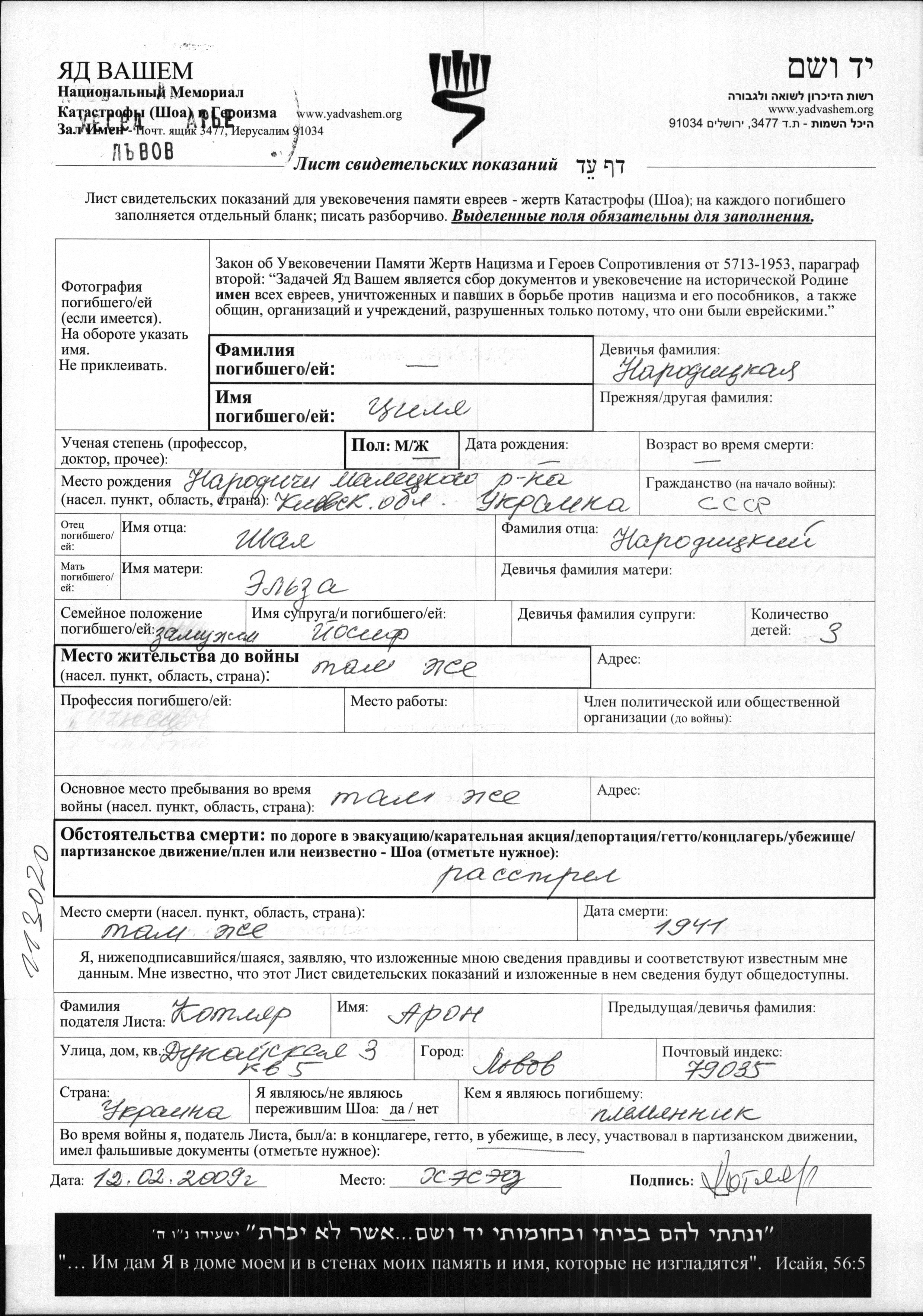 Surname unknown Tzilya Narodichi, Ukraine (USSR) Page of Testimony
