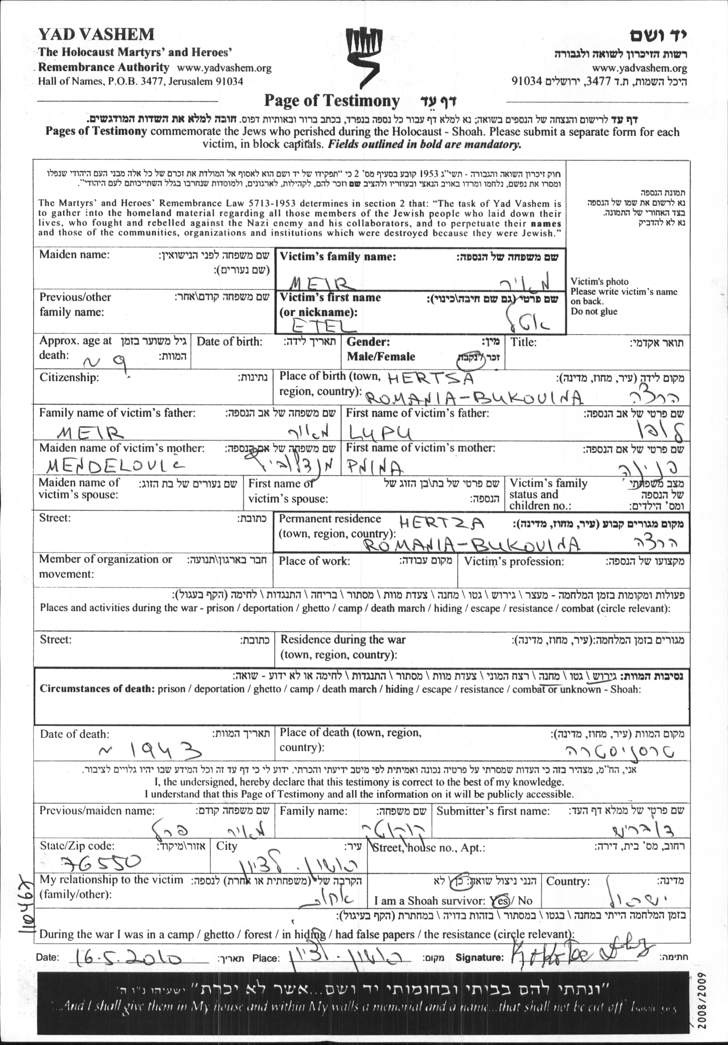 Etel Meir was born in Herta, Romania to Lupu and Pnina nee Mendelovic. She was child. Prior to WWII she lived in Herta, Romania. During the war she was in Romania.
