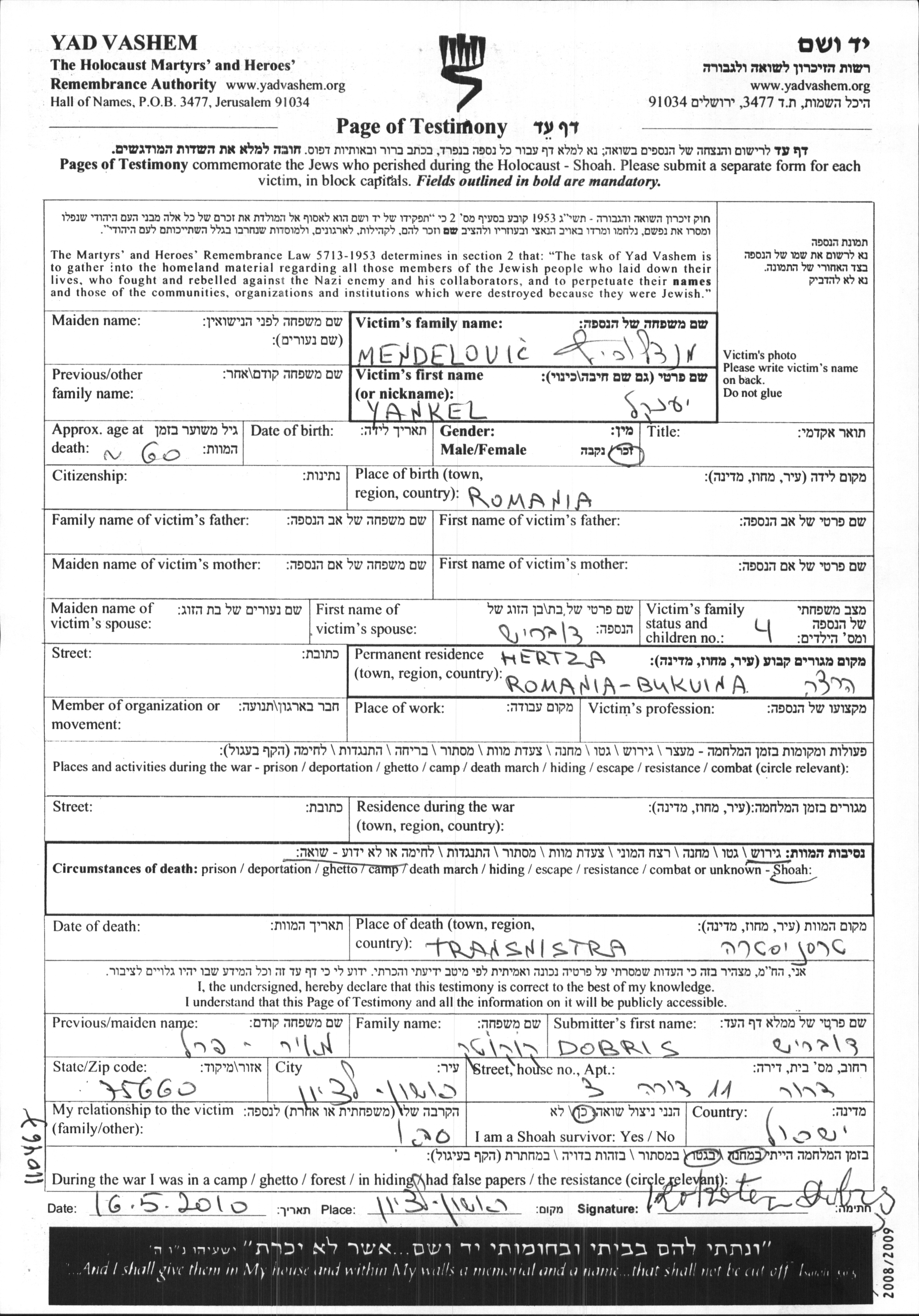 Mendelovitz Yankel Herta, Romania Page of Testimony