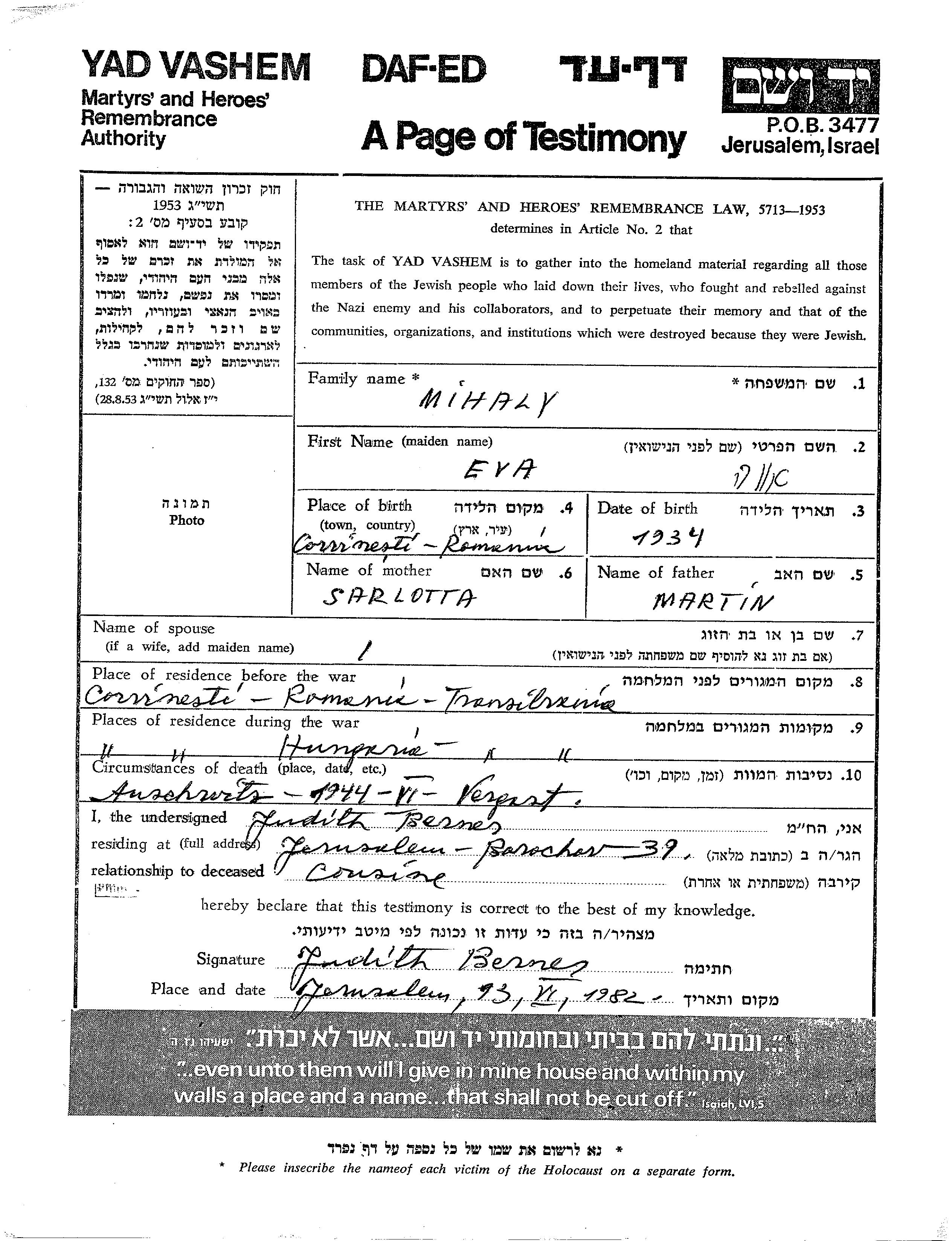 Eva Mihaly was born in Corvinesti, Romania, 1934 to Martin and Sarlotta. Prior to WWII she lived in Corvinesti, Romania. During the war she was in Corvinesti, Romania. Eva was murdered in the Shoah. Place of death: Auschwitz, Poland, 06/1944.