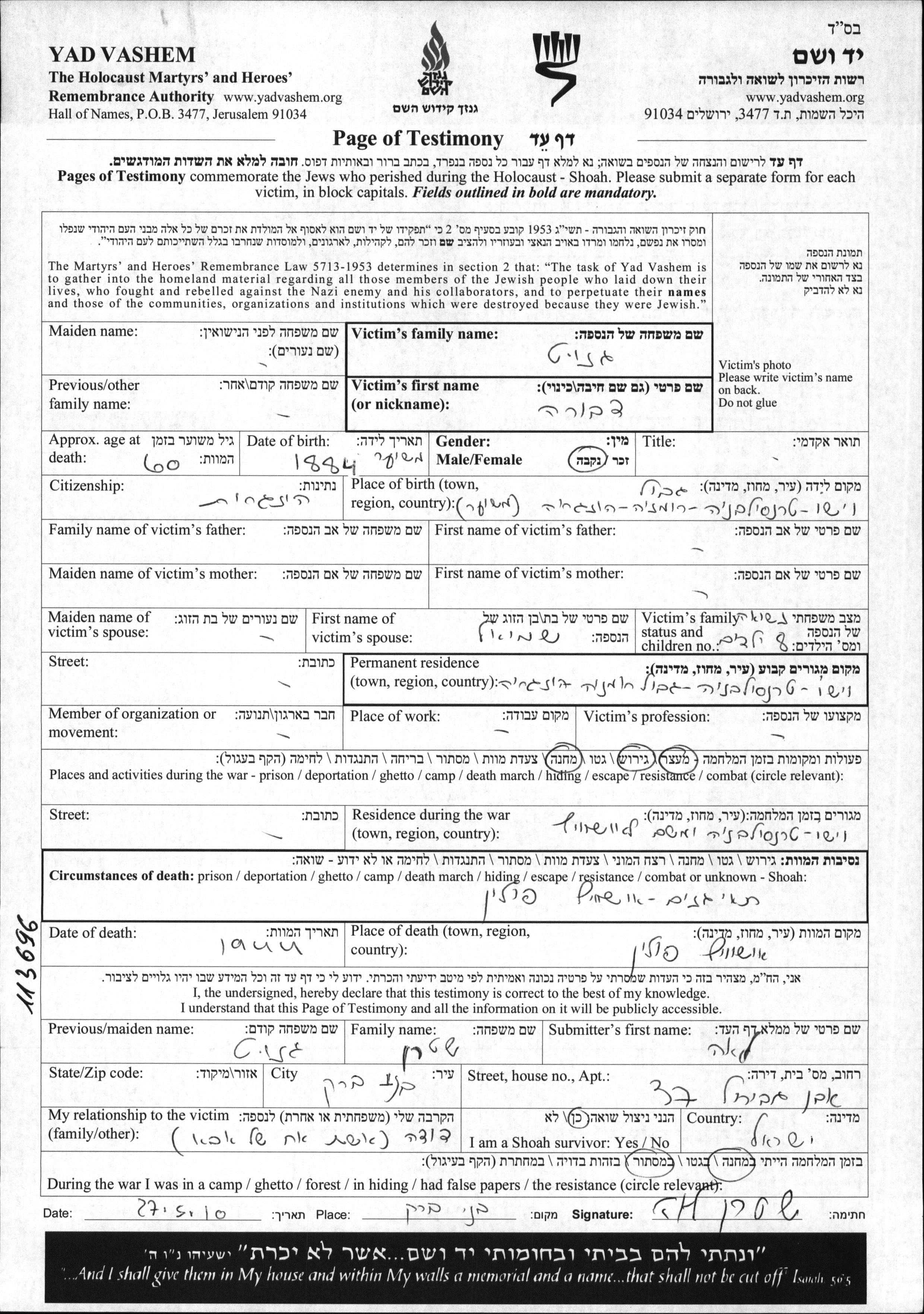 Dvora Genut was born in Viso, Romania, 1884. She was married to Shmuel. Prior to WWII she lived in Viso, Romania. During the war she was in Viso, Romania. Dvora was murdered in the Shoah. Place of death: Auschwitz, Poland, 1944.