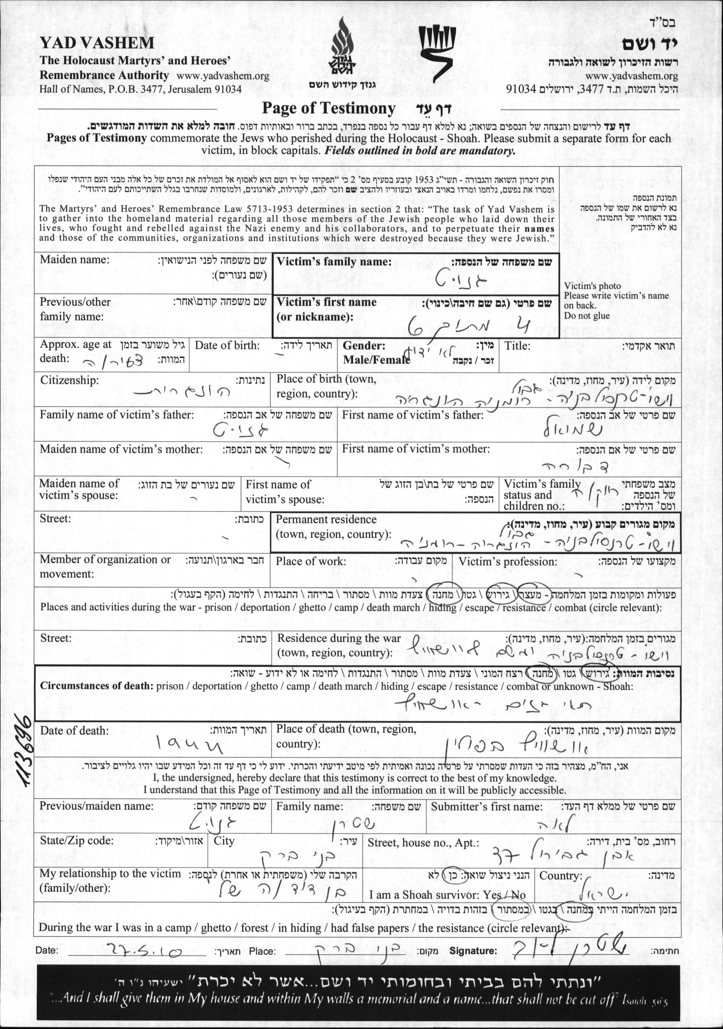 First name unknown Genut was born in Viso, Romania to Shmuel and Dvora. Was teenager. Prior to WWII lived in Viso, Romania. During the war was in Viso, Romania. Was murdered in the Shoah. Place of death: Auschwitz, Poland, 1944.