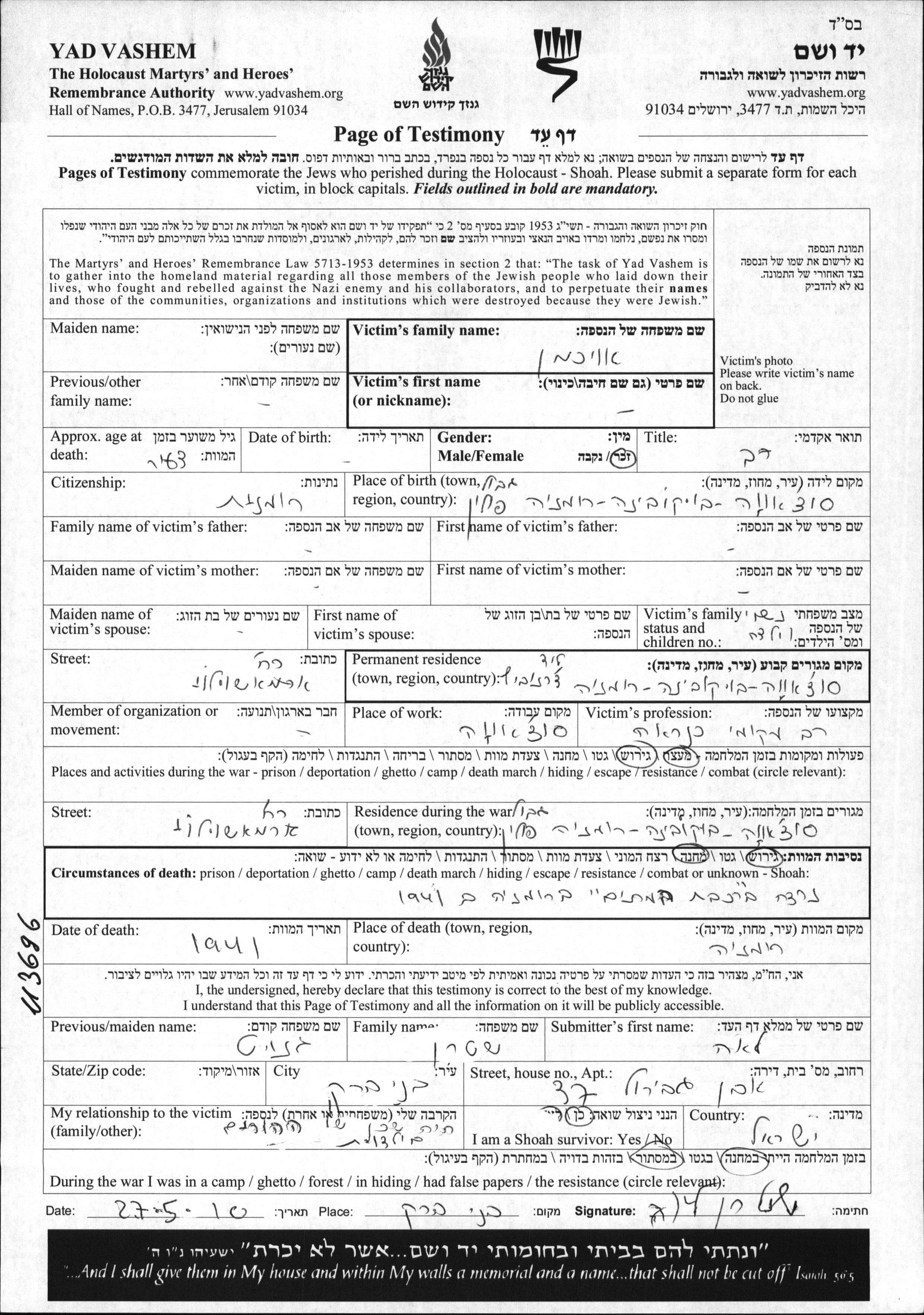 Rabbi First name unknown Okhman was born in Suceava, Romania. He was a rabbi and married. Prior to WWII he lived in Suceava, Romania. During the war he was in Suceava, Romania. Rabbi Okhman was murdered in the Shoah. Place of death: Romania, 1941.
