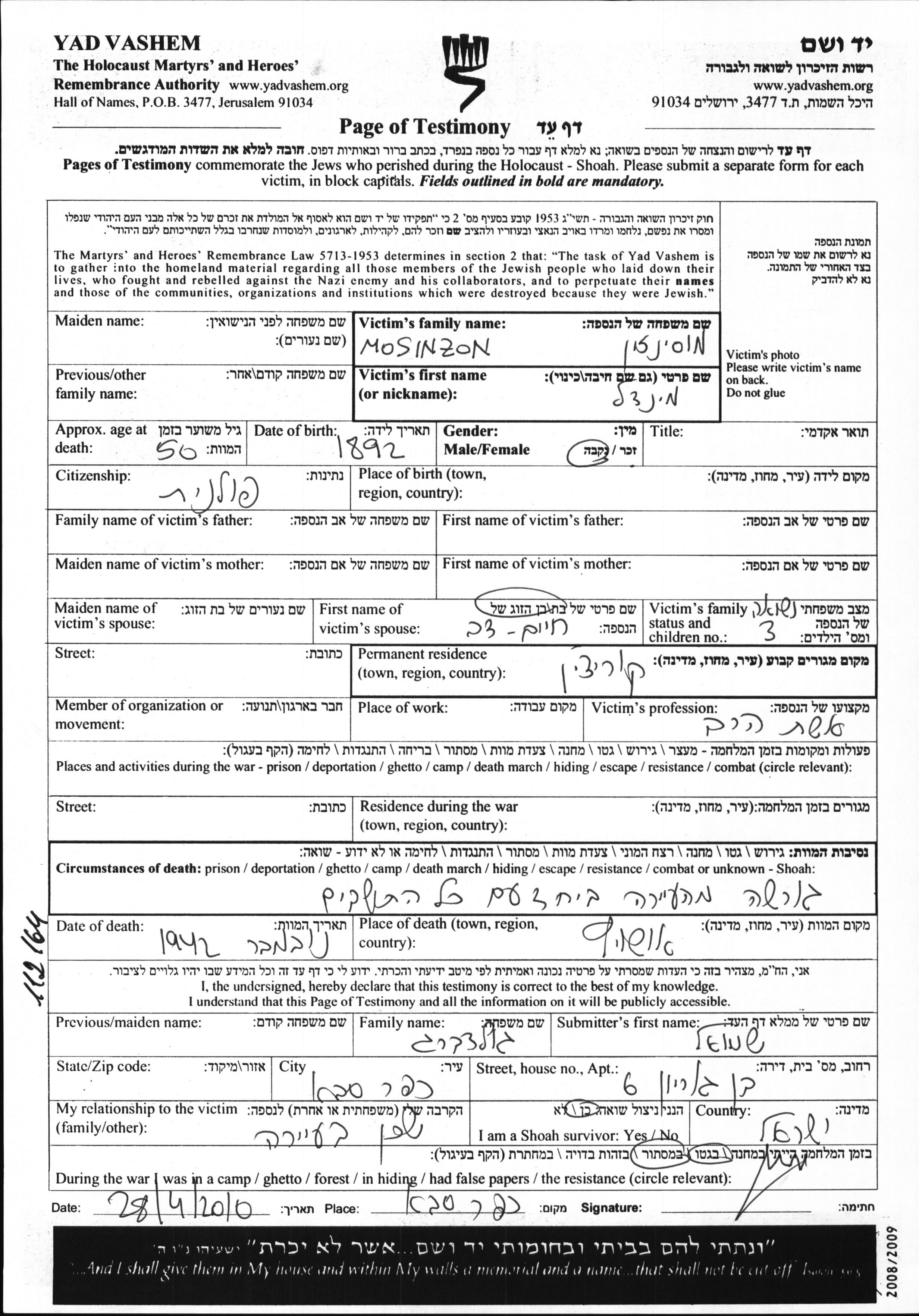 Mosinzon Mindl 1892 Korychin, Poland Page of Testimony