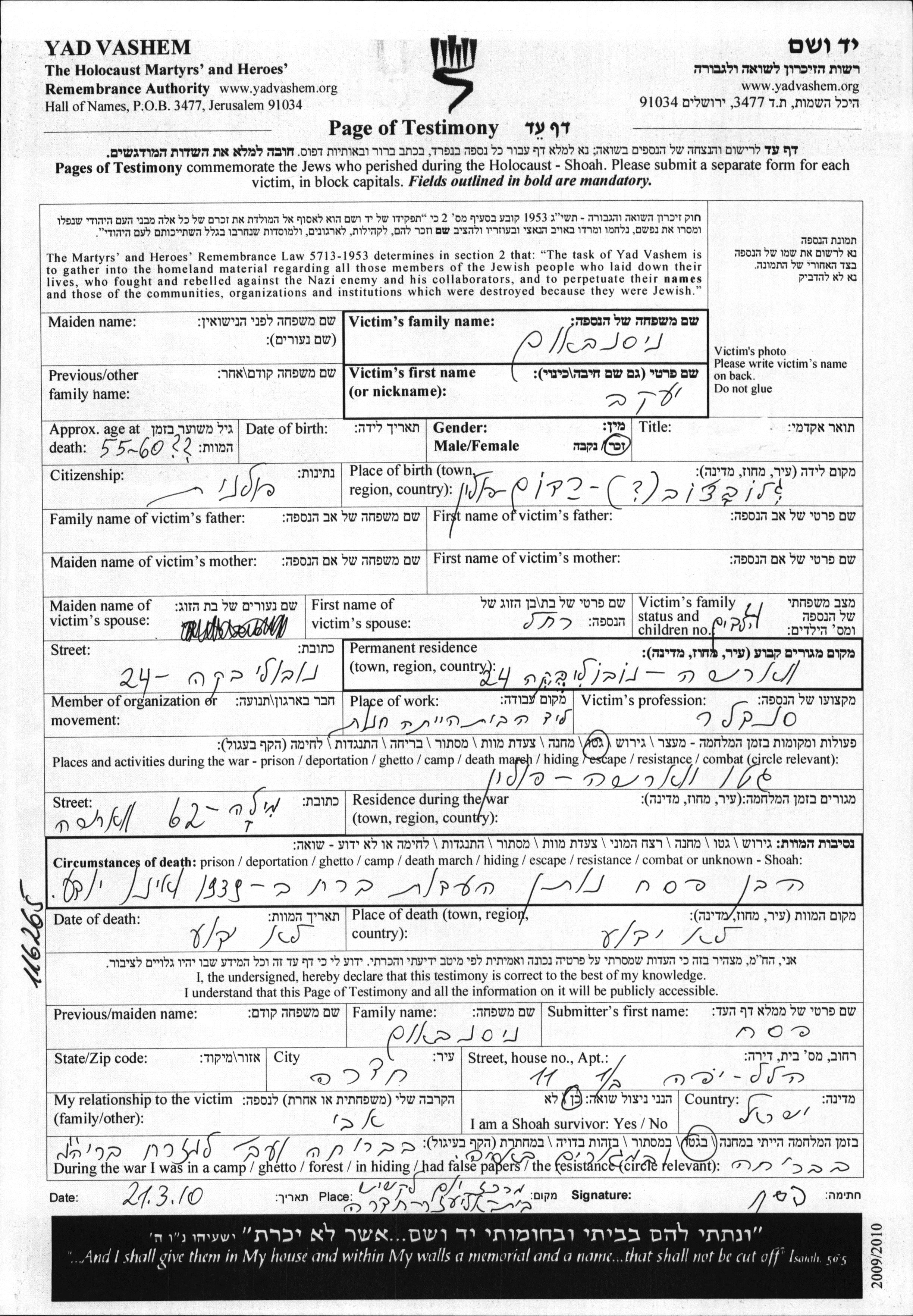 Yaakov Nisenbaum was born in Glowaczow, Poland. He was a shoemaker and married to Rakhel. Prior to WWII he lived in Warszawa, Poland. During the war he was in Warszawa, Poland. Yaakov was murdered in the Shoah.