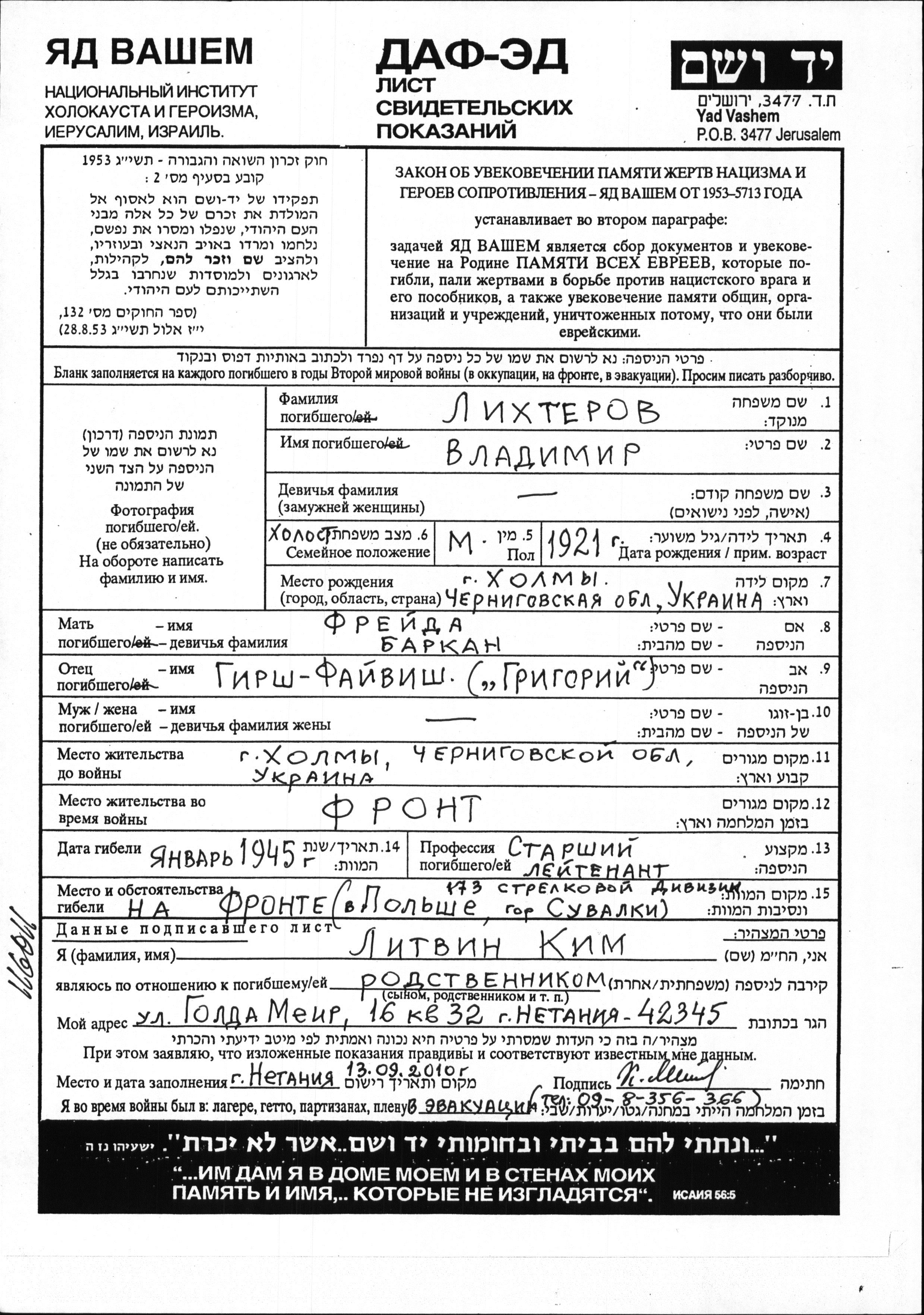 Lieutenant Vladimir Likhterov was born in Kholmy, Ukraine (USSR), 1921 to Girsh Fayvish Grigori and Freyda nee Barkan. He was single. Prior to WWII he lived in Kholmy, Ukraine (USSR). During the war he was in the Soviet armed forces. Lieutenant Likhterov was killed in military service in WWII. Place of death: Suwalki, Poland, 01/1945.