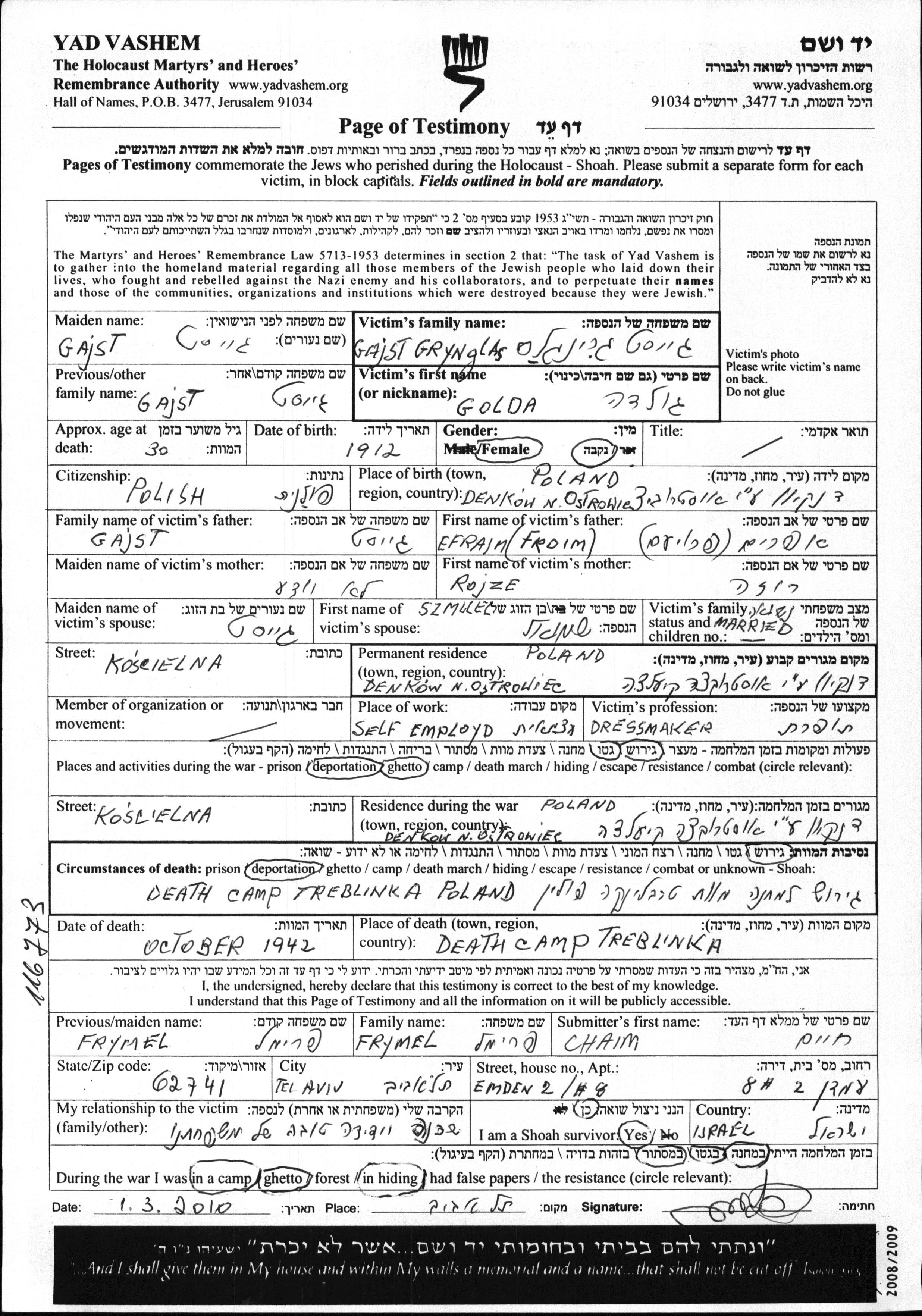 Golda Grynglas nee Gajst was born in Denkow, Poland, 1912 to Efraim and Rojze. She was a modiste and married to Shmuel. Prior to WWII she lived in Denkow, Poland. During the war she was in Denkow, Poland. Golda was murdered in the Shoah. Place of death: Treblinka, Poland, 10/1942.
