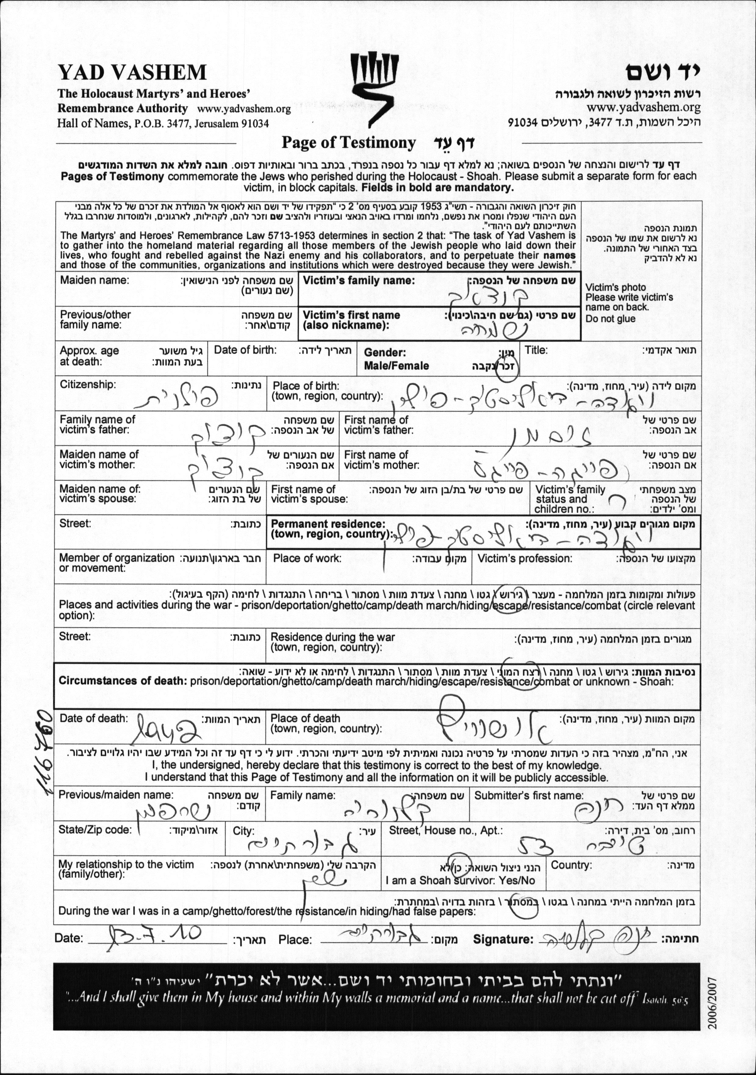 Simkha Kochak was born in Wygoda, Poland to Zusman and Feiga. He was single. Prior to WWII he lived in Wygoda, Poland. Simkha was murdered in the Shoah. Place of death: Auschwitz, Poland, 1942.