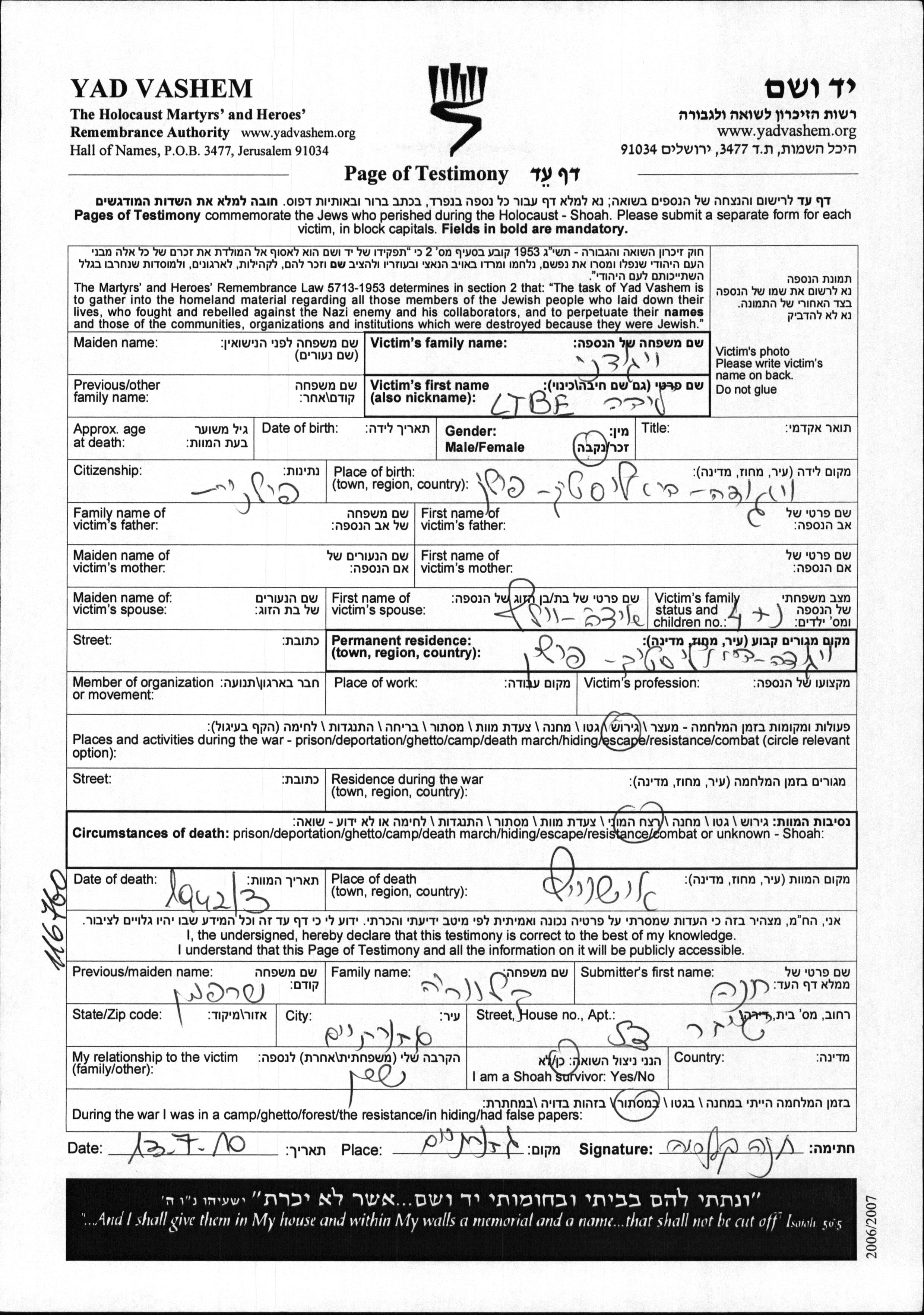 Libe Vigodni was born in Wygoda, Poland. She was married to Icie Volf. Prior to WWII she lived in Wygoda, Poland. Libe was murdered in the Shoah. Place of death: Auschwitz, Poland, 1942.
