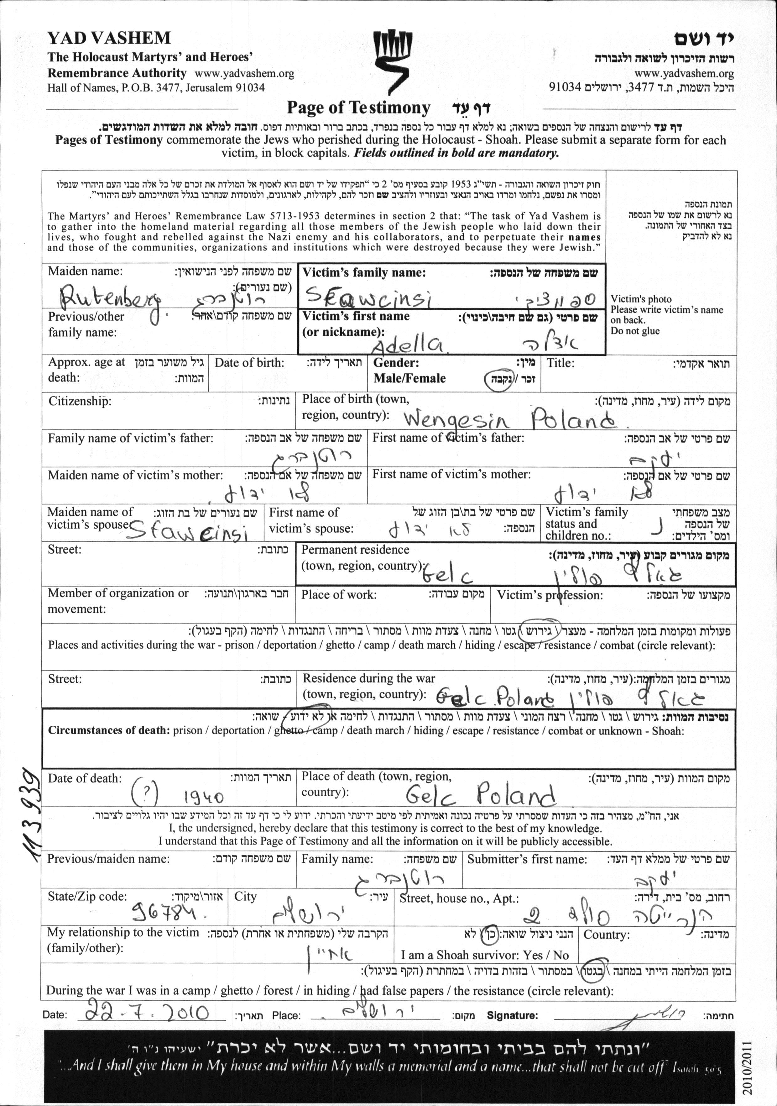 Adella Sfawcinsi nee Rutenberg was born in Wengensin, Poland to Yaakov. She was married. Prior to WWII she lived in Kielce, Poland. During the war she was in Kielce, Poland. Adella was murdered in the Shoah. Place of death: Kielce, Poland, 1940.