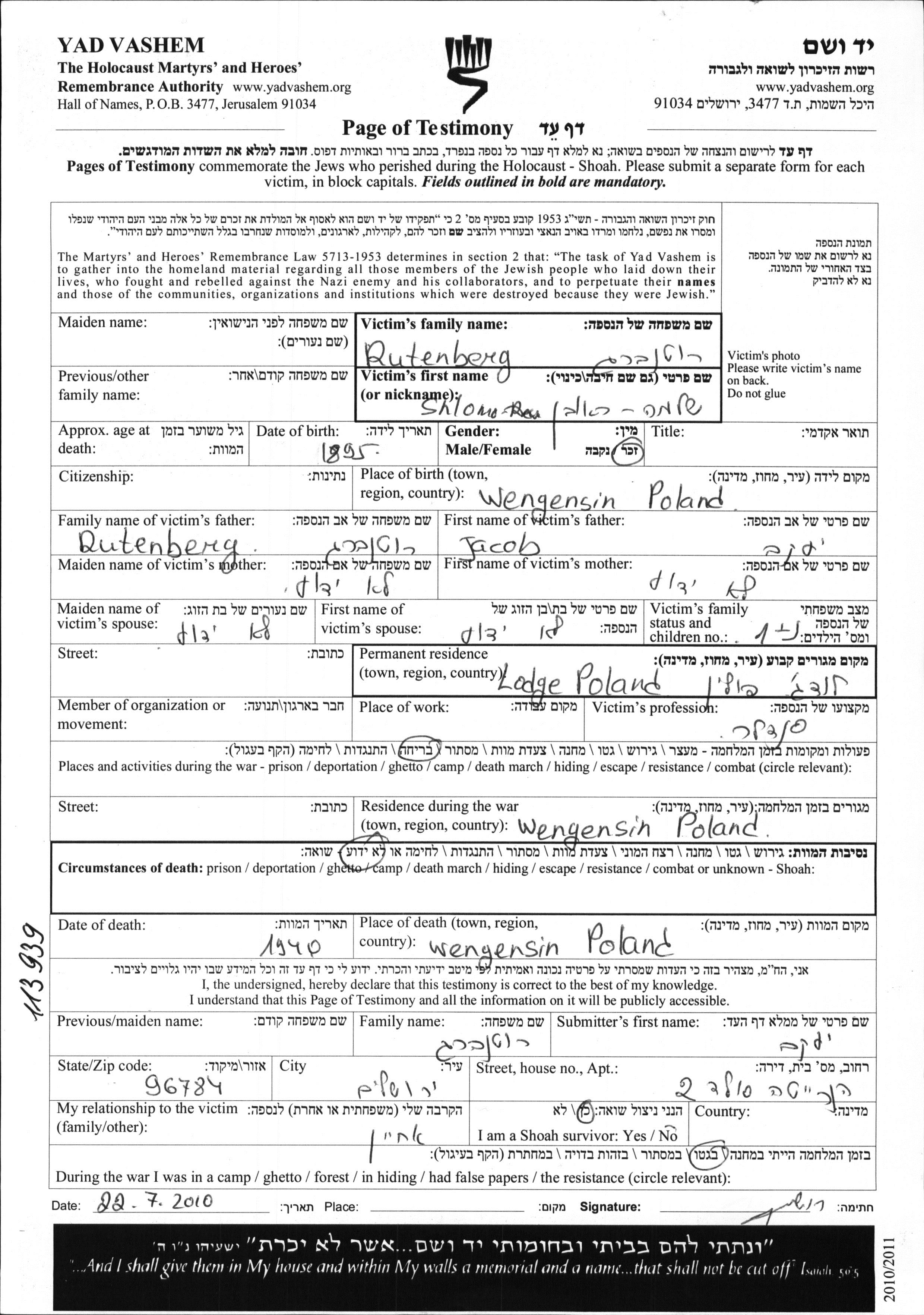 Shlomo Reuven Rutenberg was born in Wengensin, Poland, 1895 to Jacob. He was a shoemaker and married. Prior to WWII he lived in Lodz, Poland. During the war he was in Wengensin, Poland. Shlomo Reuven was murdered in the Shoah. Place of death: Wengensin, Poland, 1940.