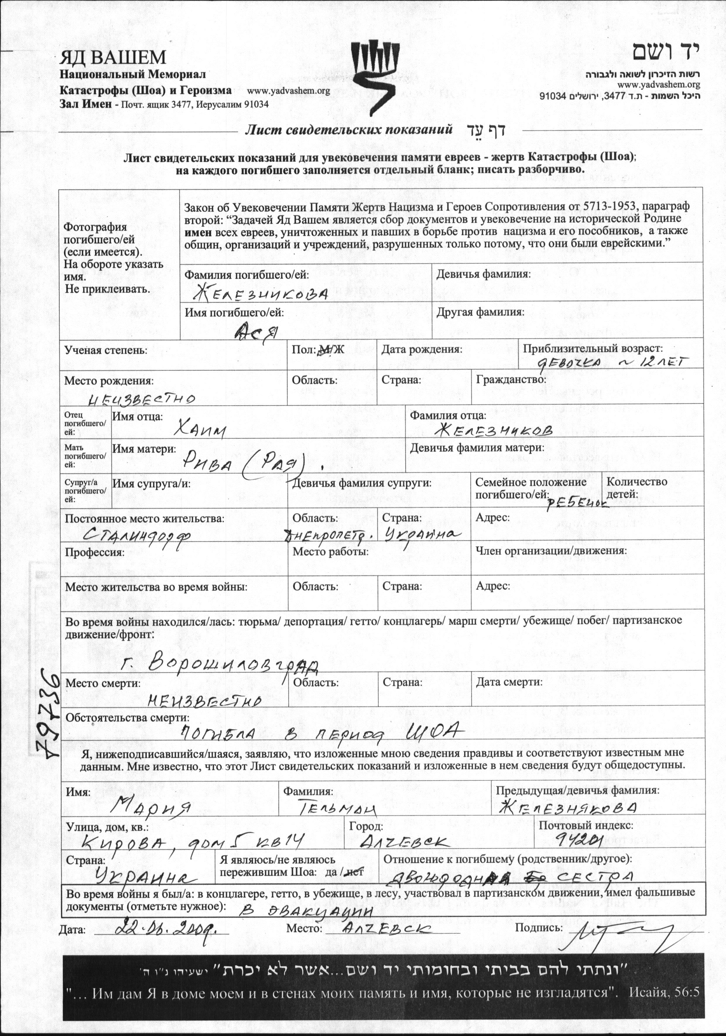 Zheleznikova Asya Stalindorf, Ukraine (USSR) Page of Testimony