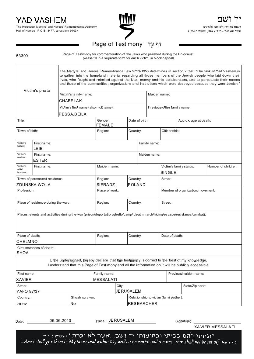 Chabelak Pessa Beila Zdunska Wola, Poland Page of Testimony (digital)