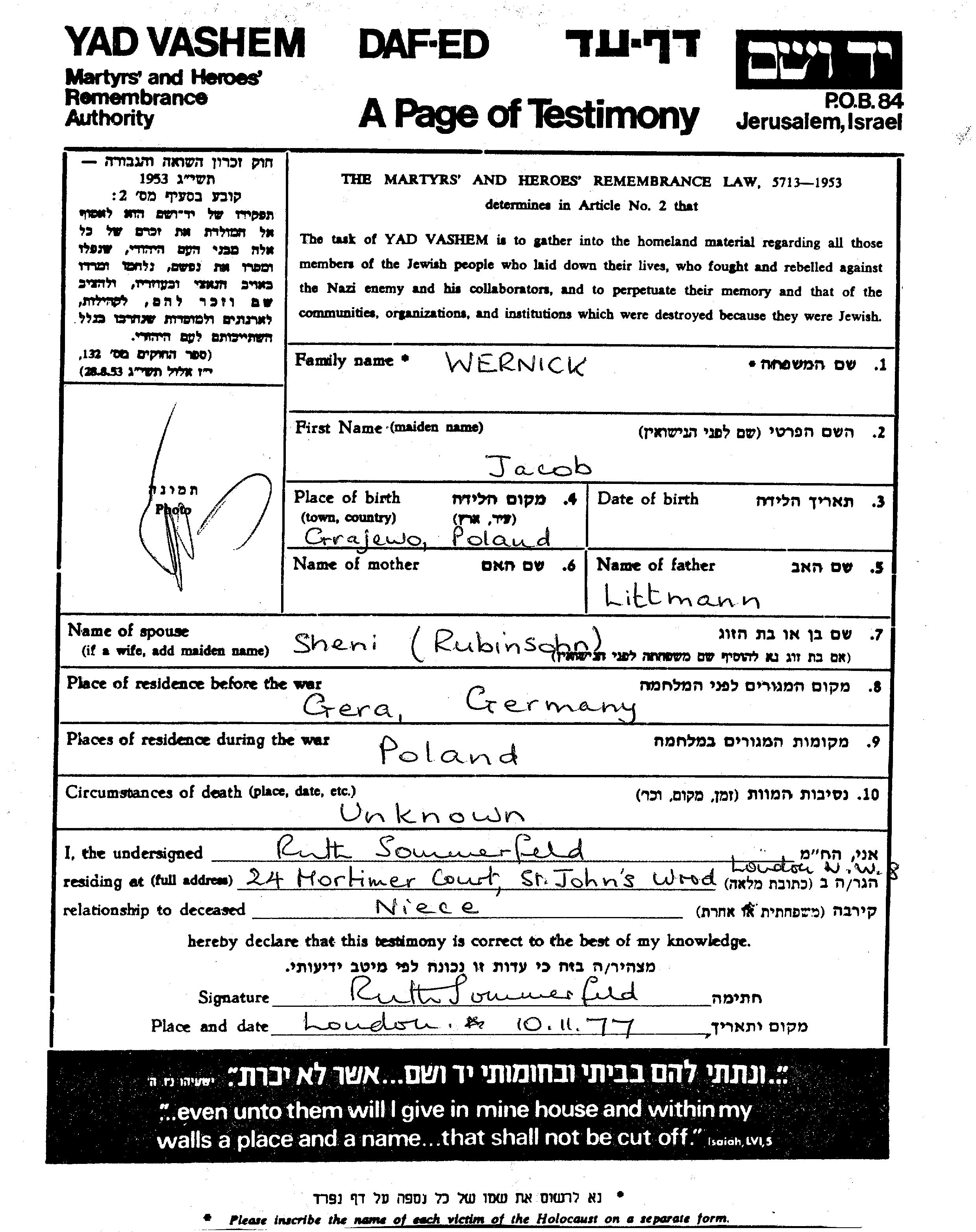 Wernick Jacob Gera, Germany Page of Testimony