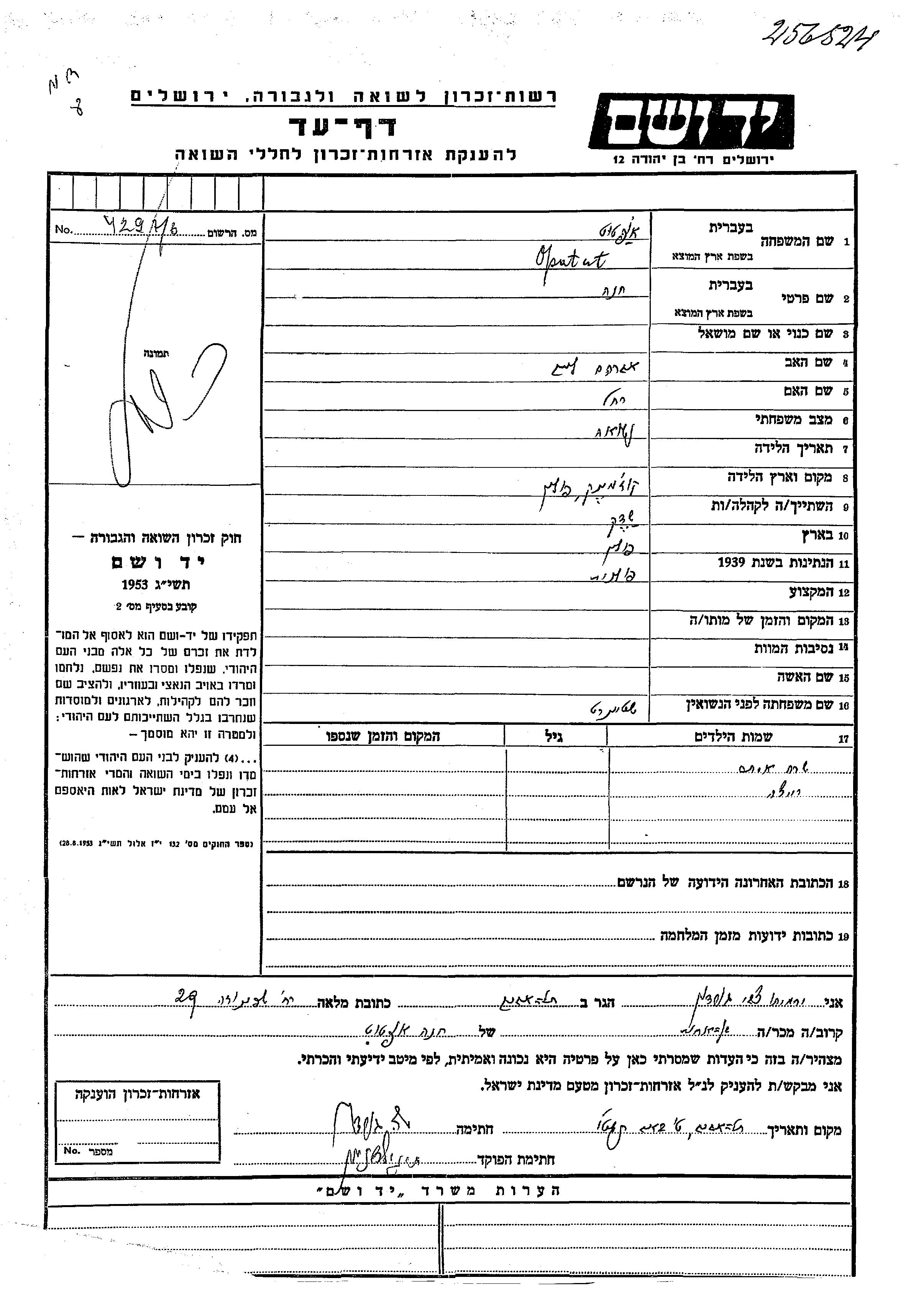 Yad Vashem - Pages of Testimony Names Memorial Collection