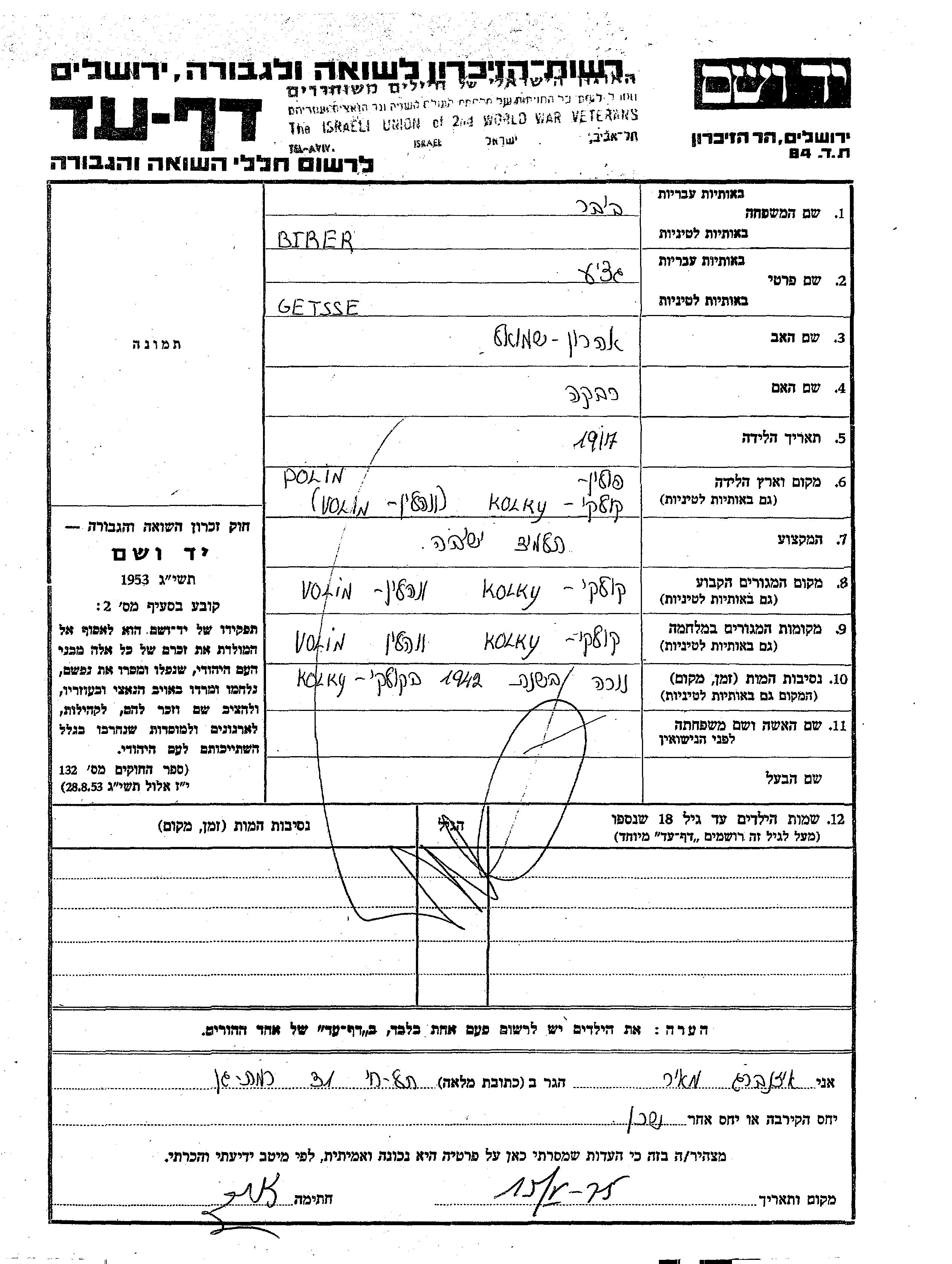 Getsse Biber was born in Kołki, Poland, 1917 to Aharon Shmuel and Rivka. He was a yeshiva student. Prior to WWII he lived in Kołki, Poland. During the war he was in Kołki, Poland. Getsse was murdered in the Shoah. Place of death: Kołki, Poland, 1942.