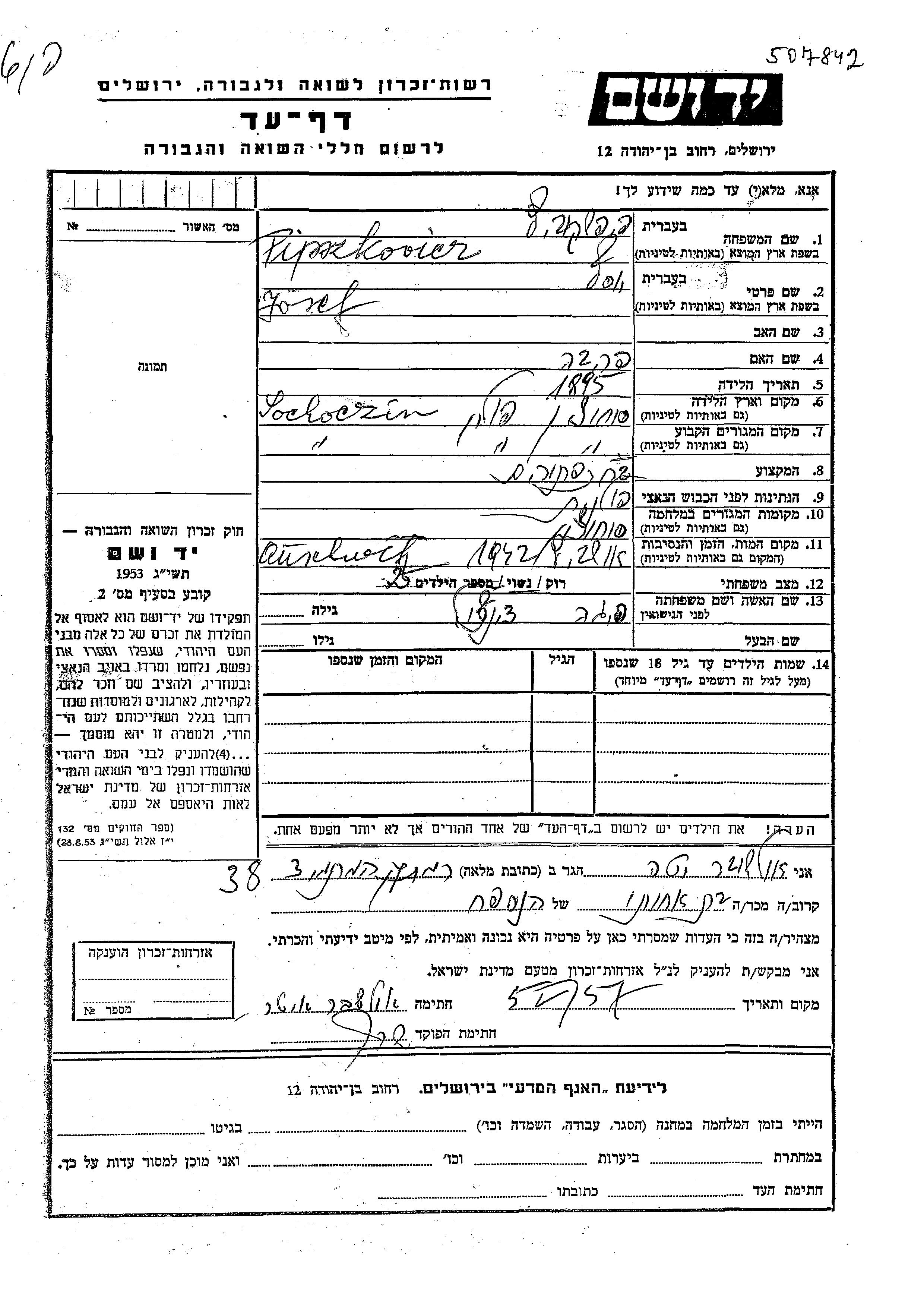 Josef Pipszkovicz was born in Sochocin, Poland, 1895 to Priva. He was married to Feiga nee Dinchol. Prior to WWII he lived in Sochocin, Poland. During the war he was in Sochocin, Poland. Josef was murdered in the Shoah. Place of death: Auschwitz, Poland, 1942.