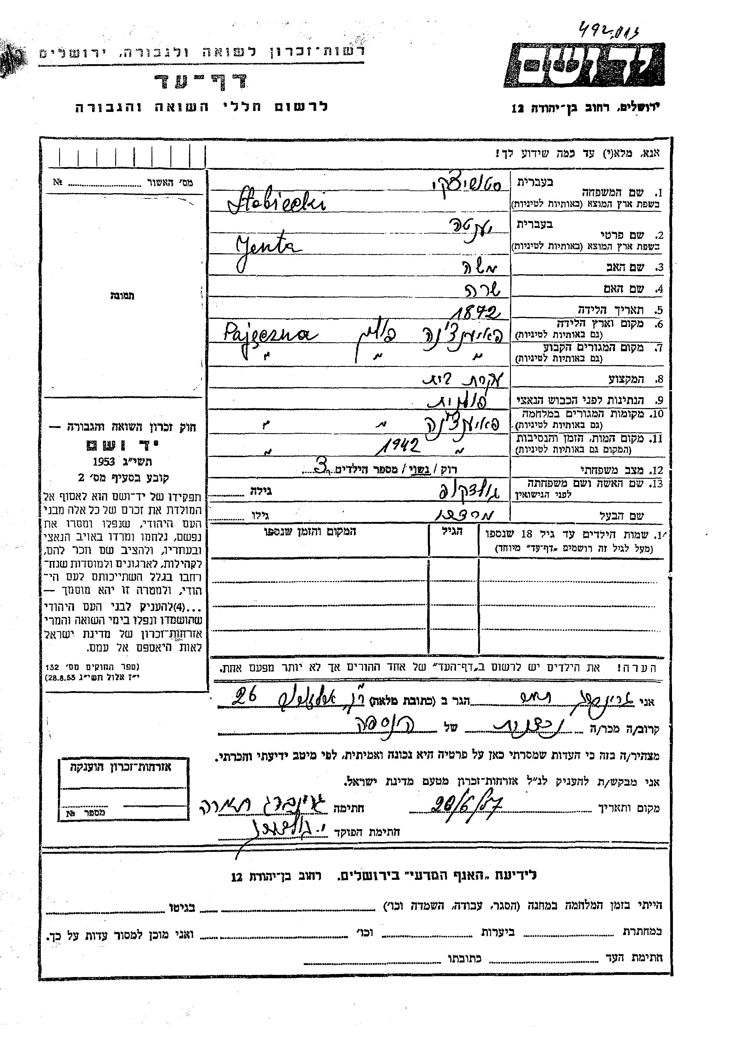 Jenta Stobiecki nee Goldkof was born in Pajeczno, Poland, 1872 to Moshe and Sara. She was a housewife and married to Mordekhai. Prior to WWII she lived in Pajeczno, Poland. During the war she was in Pajeczno, Poland. Jenta was murdered in the Shoah. Place of death: Pajeczno, Poland, 1942.