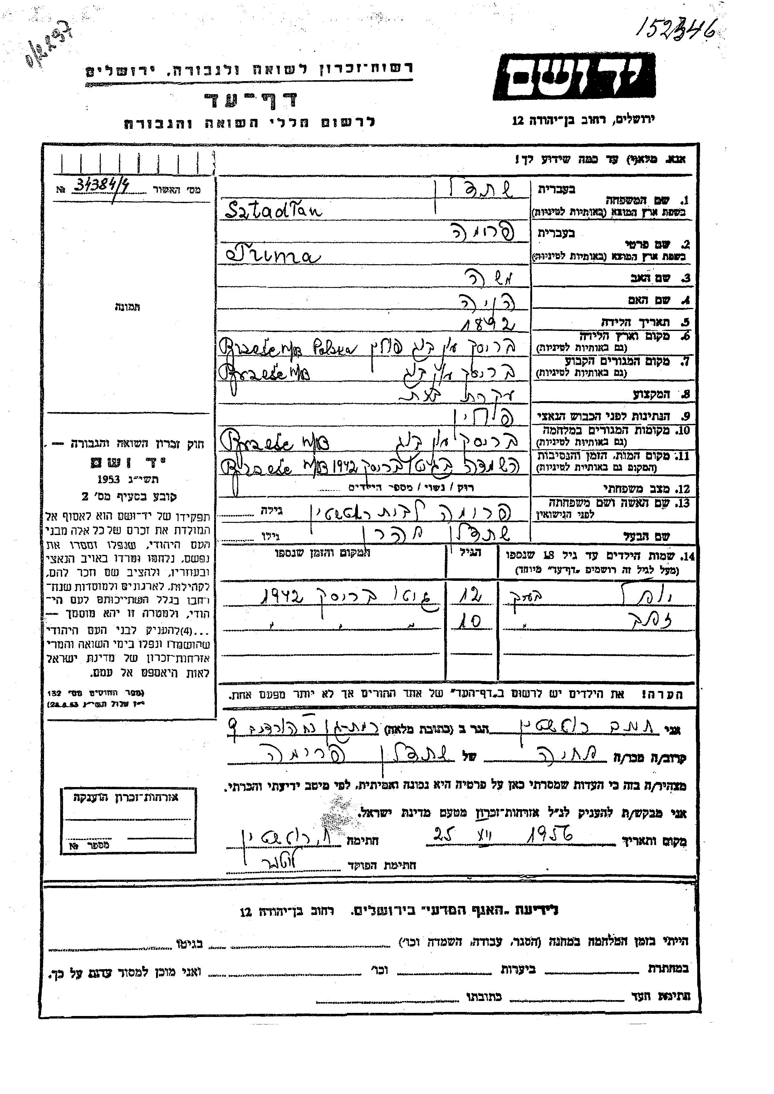 Frima Sztadlan nee Rotshtein was born in Brzesc, Poland, 1892 to Moshe and Henia. She was a housewife and married to Aharon. Prior to WWII she lived in Brzesc, Poland. During the war she was in Brzesc, Poland. Frima was murdered in the Shoah. Place of death: Brzesc, Poland, 1942.