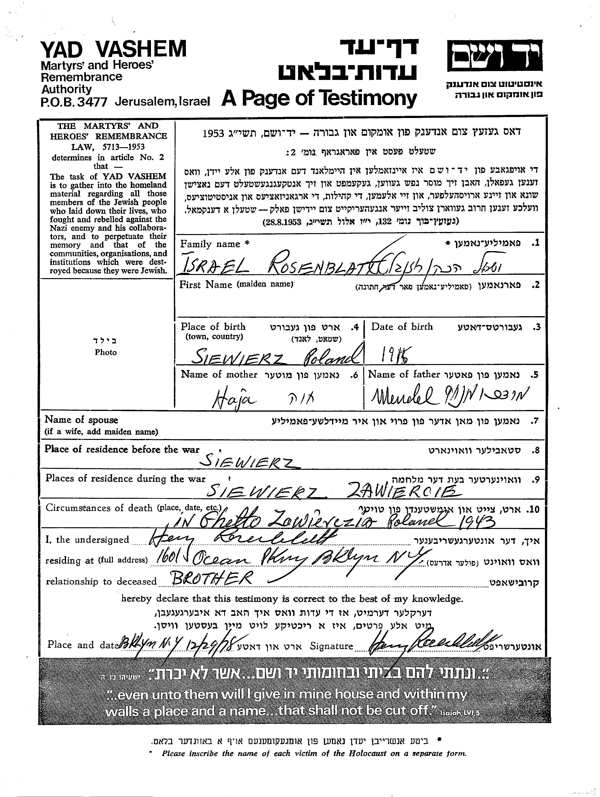 Israel Rosenblatt Hacohen was born in Siewierz, Poland, 1915 to Mendel Mordekhai Menakhem and Haja. Prior to WWII he lived in Siewierz, Poland. During the war he was in Siewierz, Poland. Israel was murdered in the Shoah. Place of death: Zawiercie, Poland, 1943.
