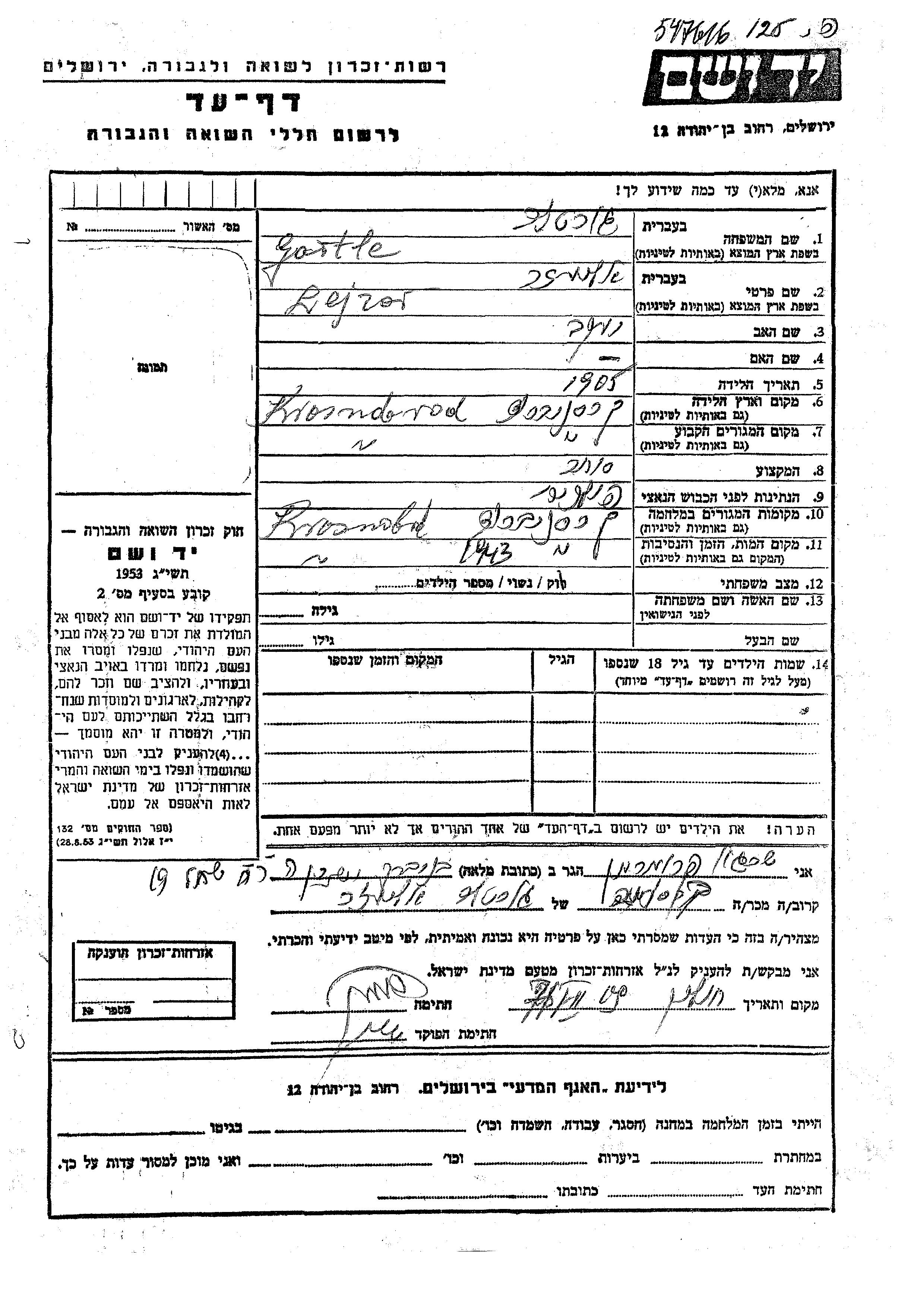 Lejzer Gortler was born in Krasnobrod, Poland, 1905 to Yaakov. He was a merchant and married. Prior to WWII he lived in Krasnobrod, Poland. During the war he was in Krasnobrod, Poland. Lejzer was murdered in the Shoah. Place of death: Krasnobrod, Poland, 1943.