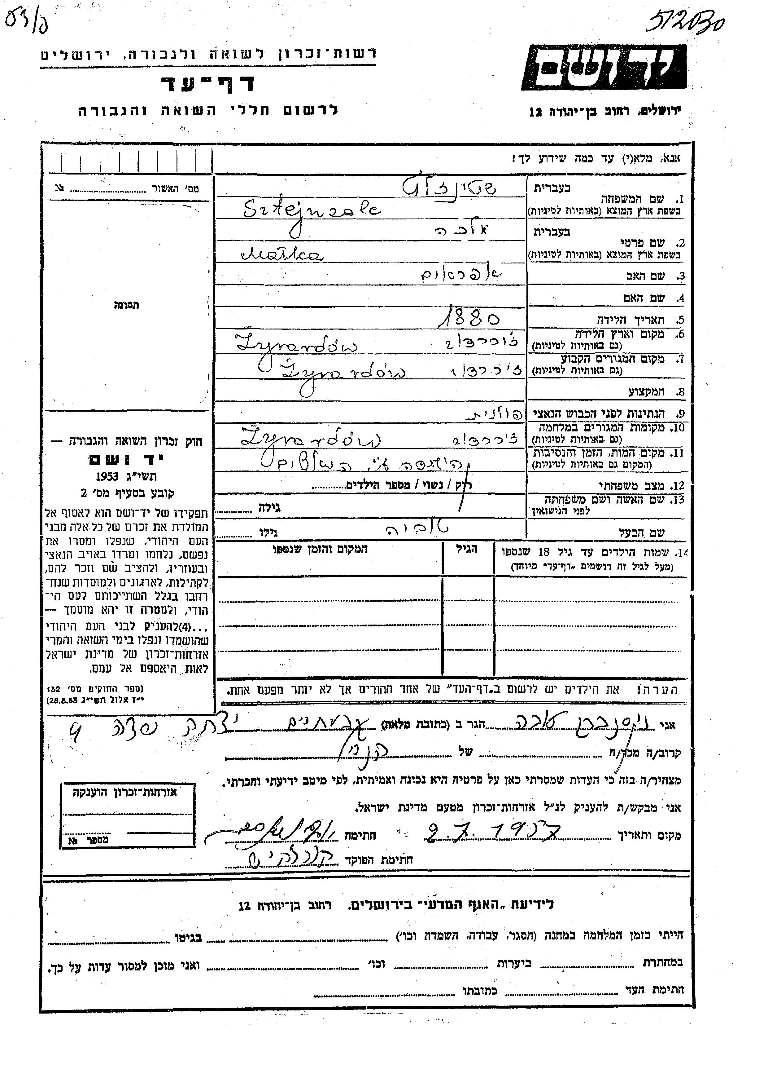 Malka Sztejnzalc was born in Zyrardow, Poland, 1880 to Efraim. She was married to Tuvia. Prior to WWII she lived in Zyrardow, Poland. During the war she was in Zyrardow, Poland. Malka was murdered in the Shoah.
