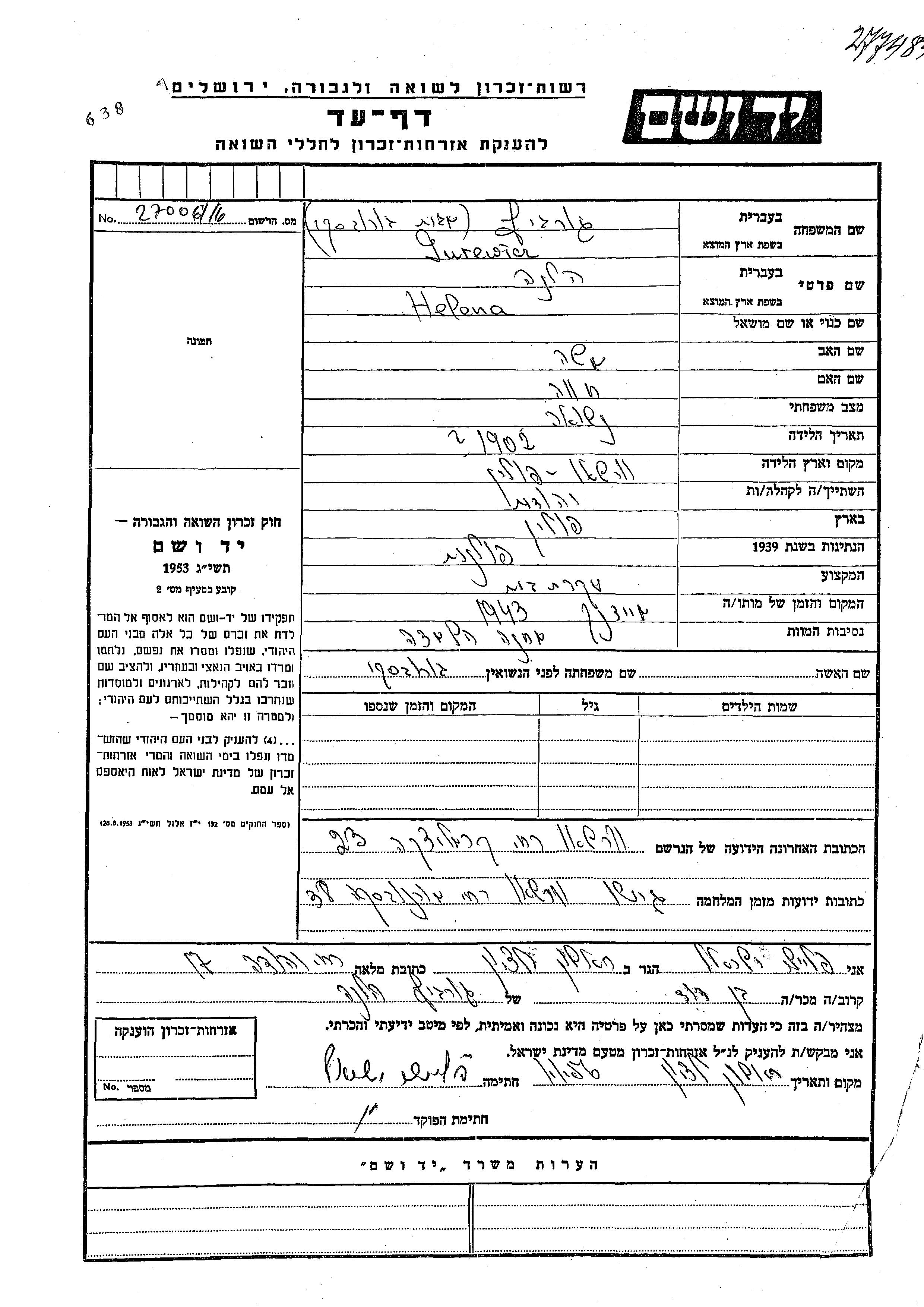 Helena Gurewicz nee Gurovski was born in Warszawa, Poland, 1902 to Moshe and Khava. She was a housewife and married. Prior to WWII she lived in Poland. During the war she was in Warszawa, Poland. Helena was murdered in the Shoah. Place of death: Majdanek, Poland, 1943.
