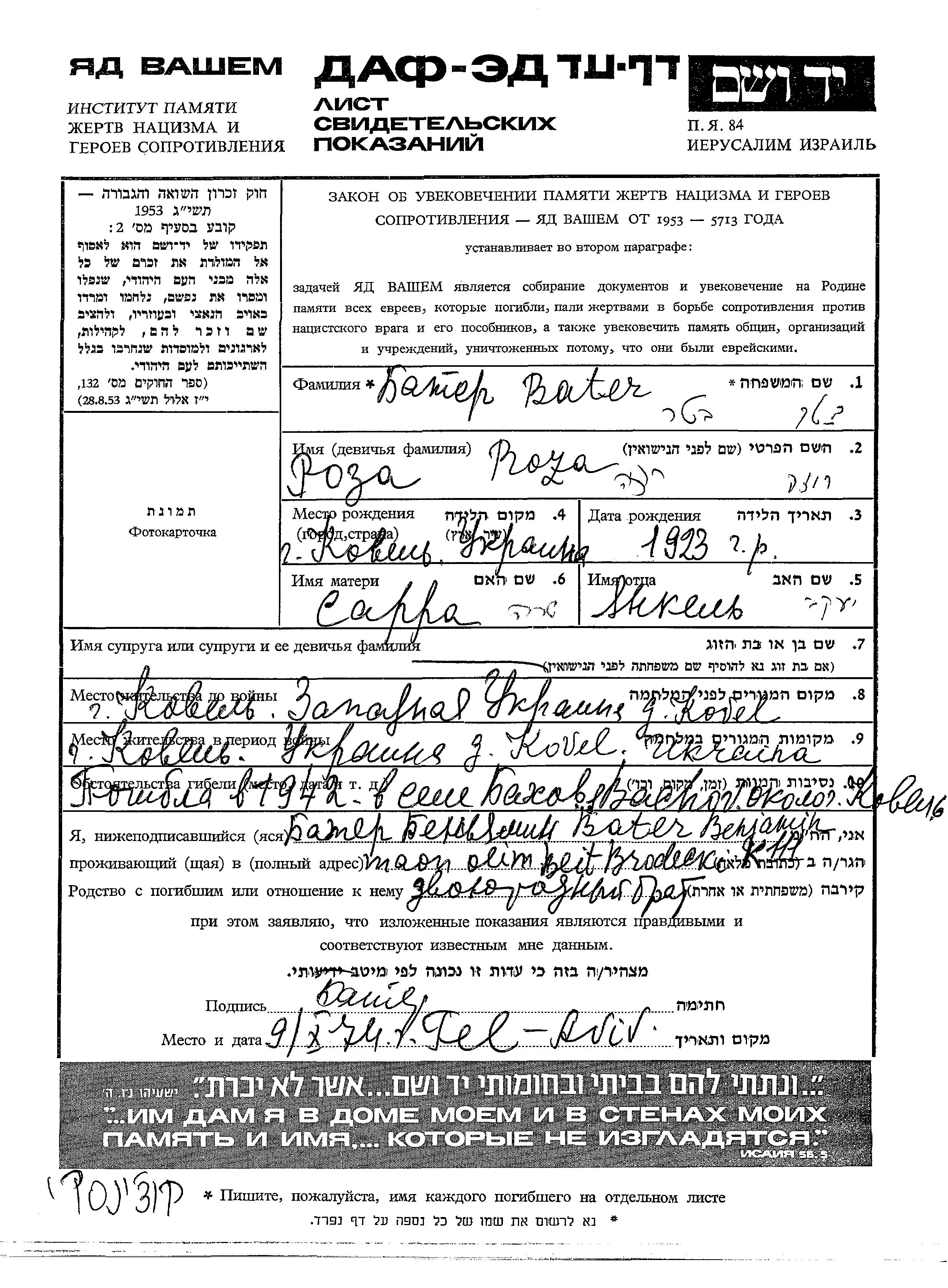 Bater Roza 1923 Kovel, Poland Page of Testimony