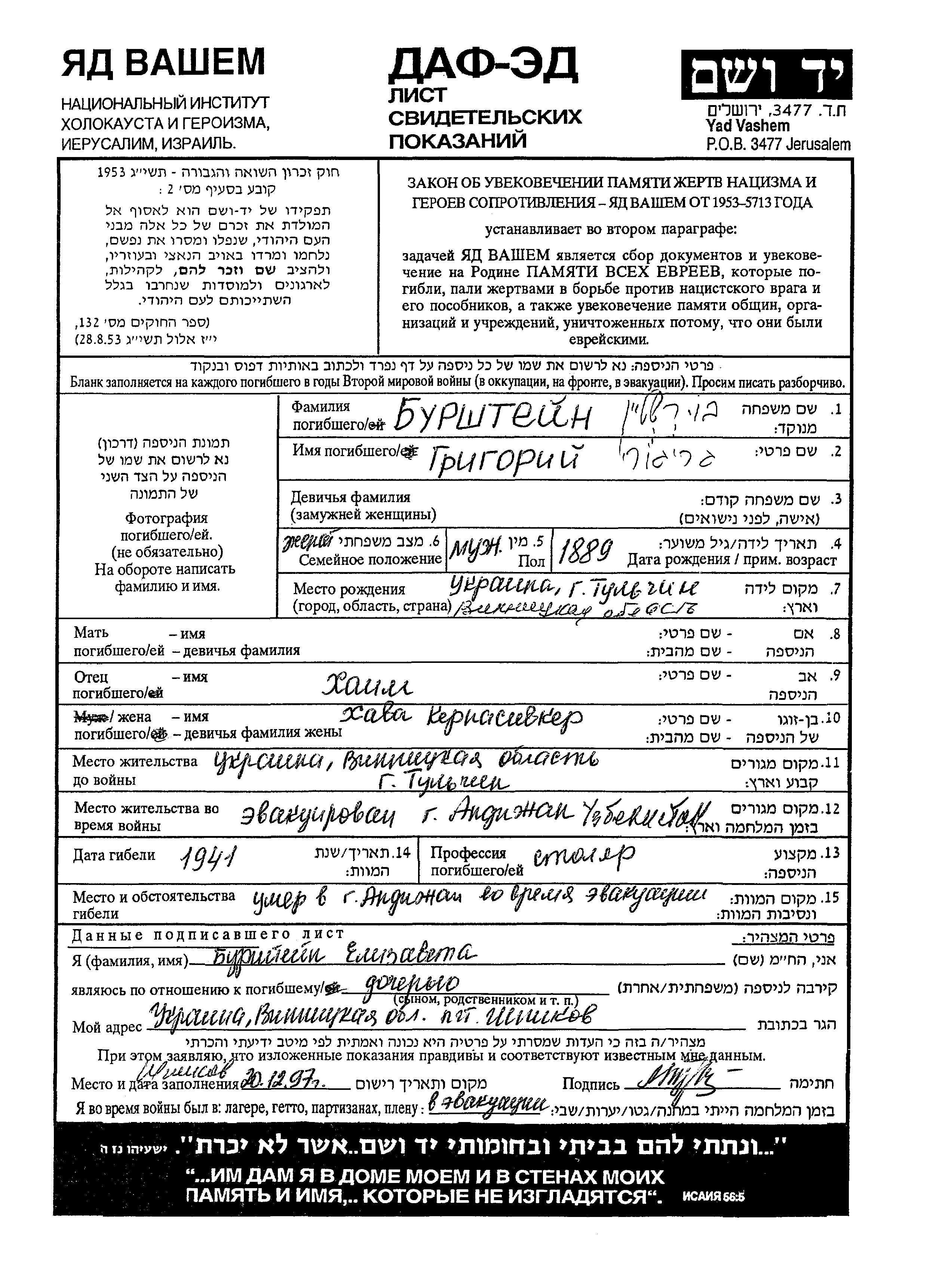 Burshtein Grigori 1889 Tulchin, Ukraine (USSR) Page of Testimony