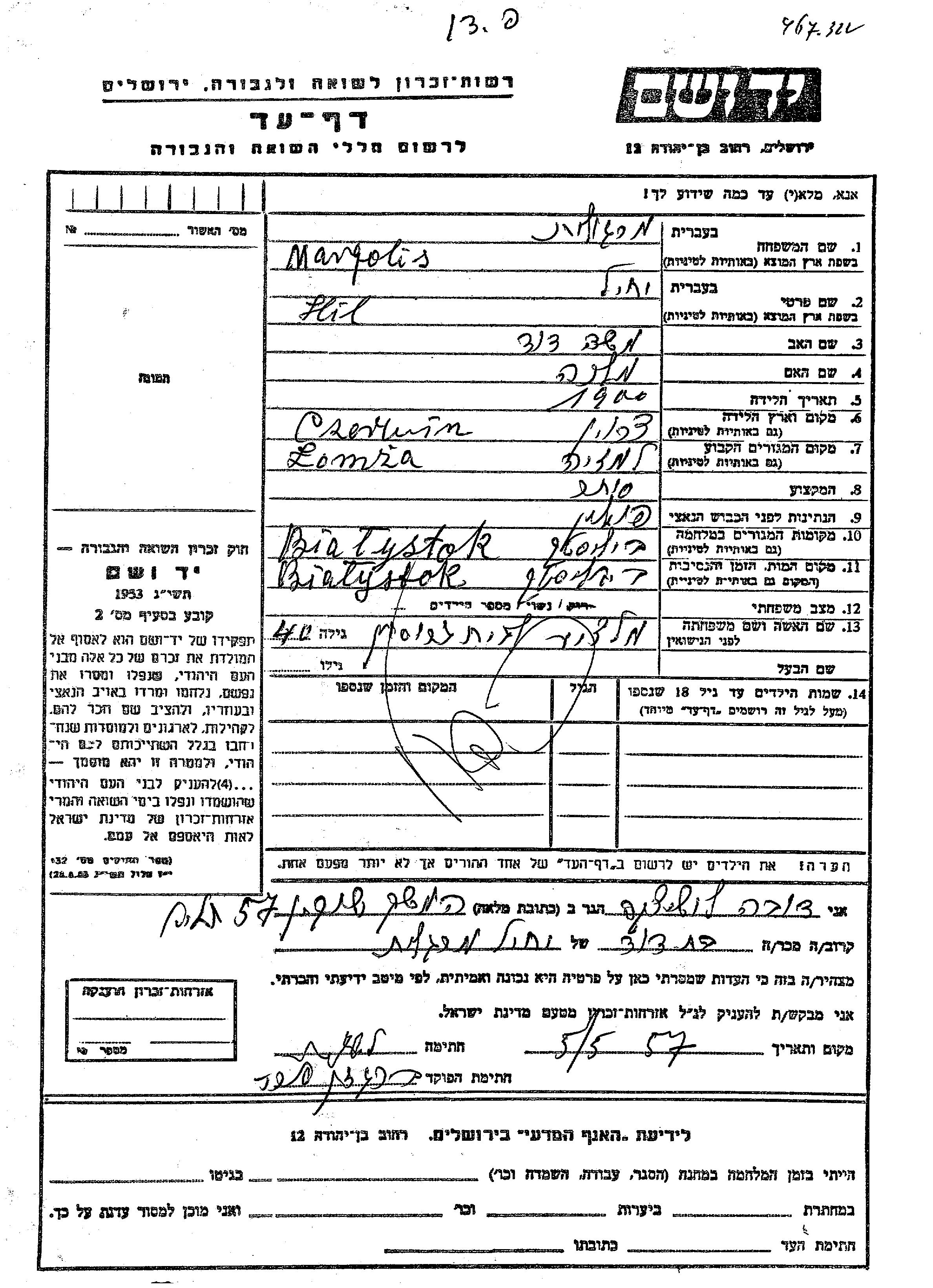 Hil Margolis was born in Czerwin, Poland, 1900 to Moshe David and Malka. He was a merchant and married to Malchie nee Grosman. Prior to WWII he lived in Łomża, Poland. During the war he was in Bialystok, Poland. Hil was murdered in the Shoah. Place of death: Bialystok, Poland.