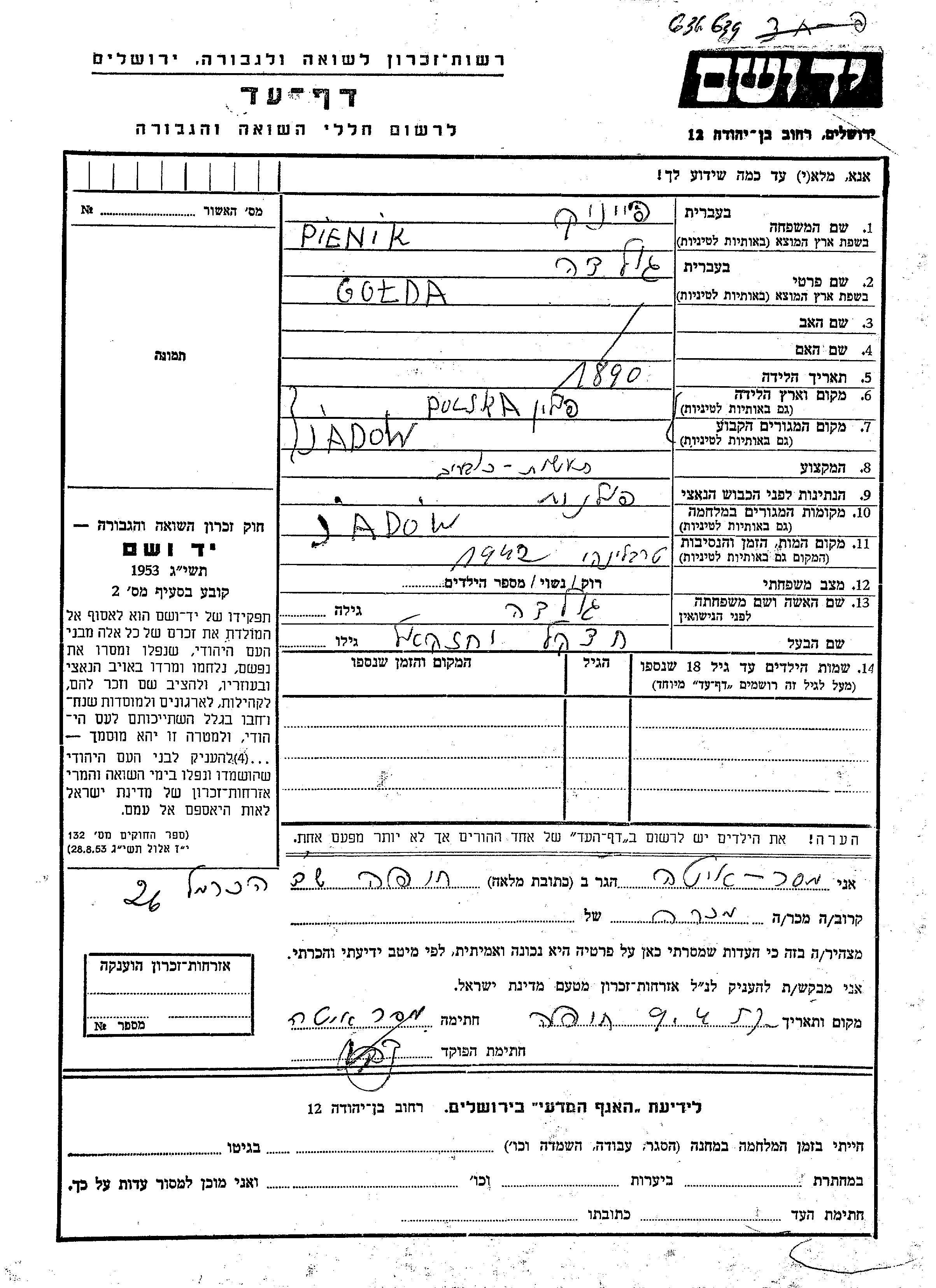 Golda Pienik was born in Jadow, Poland, 1890. She was married to Khetzkel. Prior to WWII she lived in Jadow, Poland. During the war she was in Jadow, Poland. Golda was murdered in the Shoah. Place of death: Treblinka, Poland, 1942.