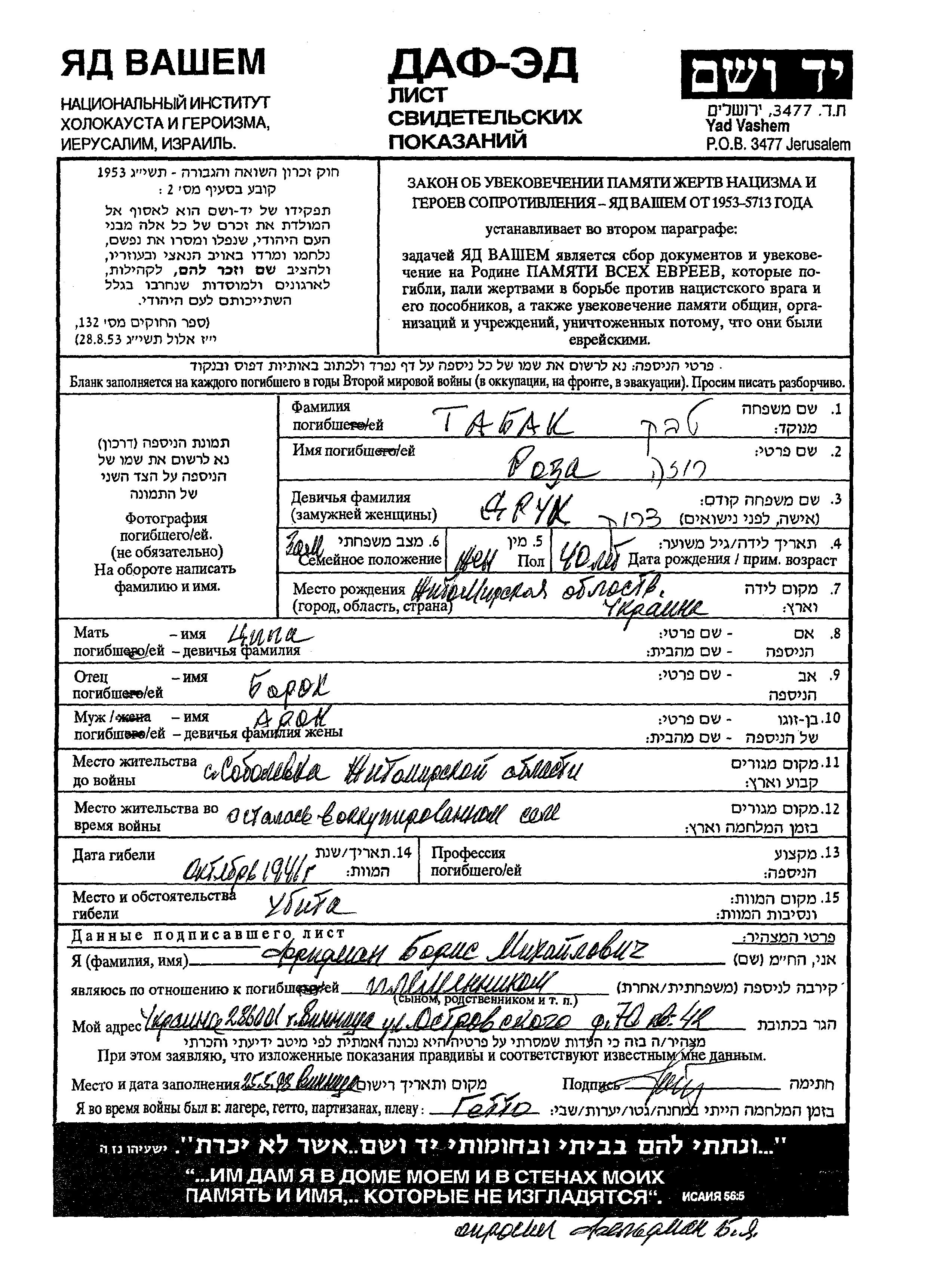 Roza Tabak nee Drok was born in Zhitomir, Ukraine (USSR) to Barokh and Tzipa. She was married to Aron. Prior to WWII she lived in Sobolevka, Ukraine (USSR). During the war she was in Sobolevka, Ukraine (USSR). Roza was murdered in the Shoah. Place of death: unknown, 10/1941.