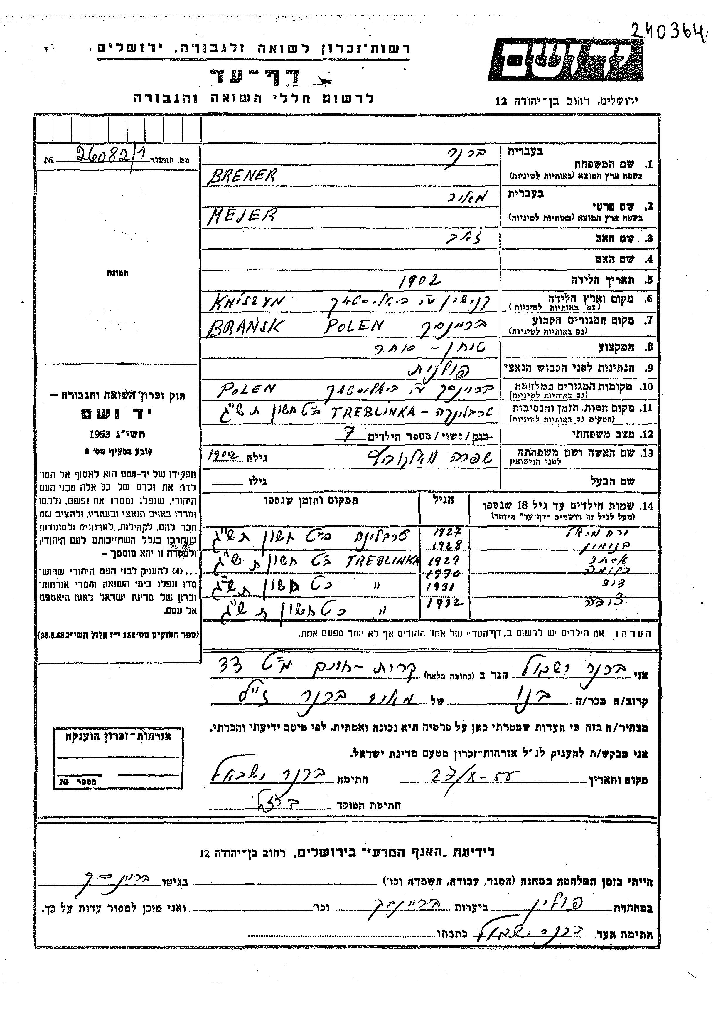 Meir Brener was born in Kniszyn, Poland, 1902 to Zeev. He was a merchant and married to Shifra nee Volkovitz. Prior to WWII he lived in Bransk, Poland. During the war he was in Bransk, Poland. Meir was murdered in the Shoah. Place of death: Treblinka I, Poland, 09/11/1942.