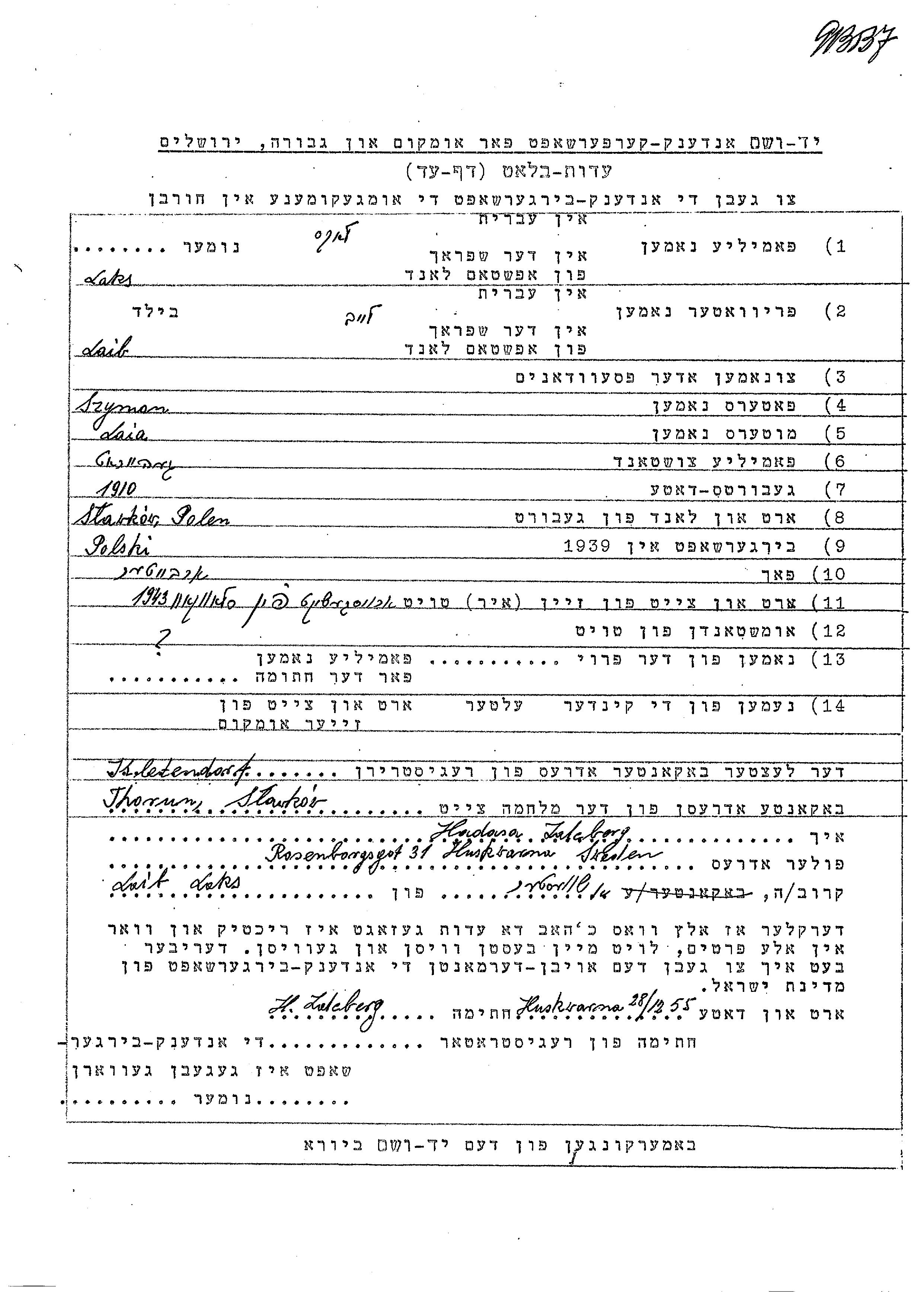 Leib Laks was born in Slawkow, Poland, 1910 to Szyman and Laia. He was a worker and married. Prior to WWII he lived in Slawkow, Poland. During the war he was in Slawkow, Poland. Leib was murdered in the Shoah. Place of death: unknown, 1943.