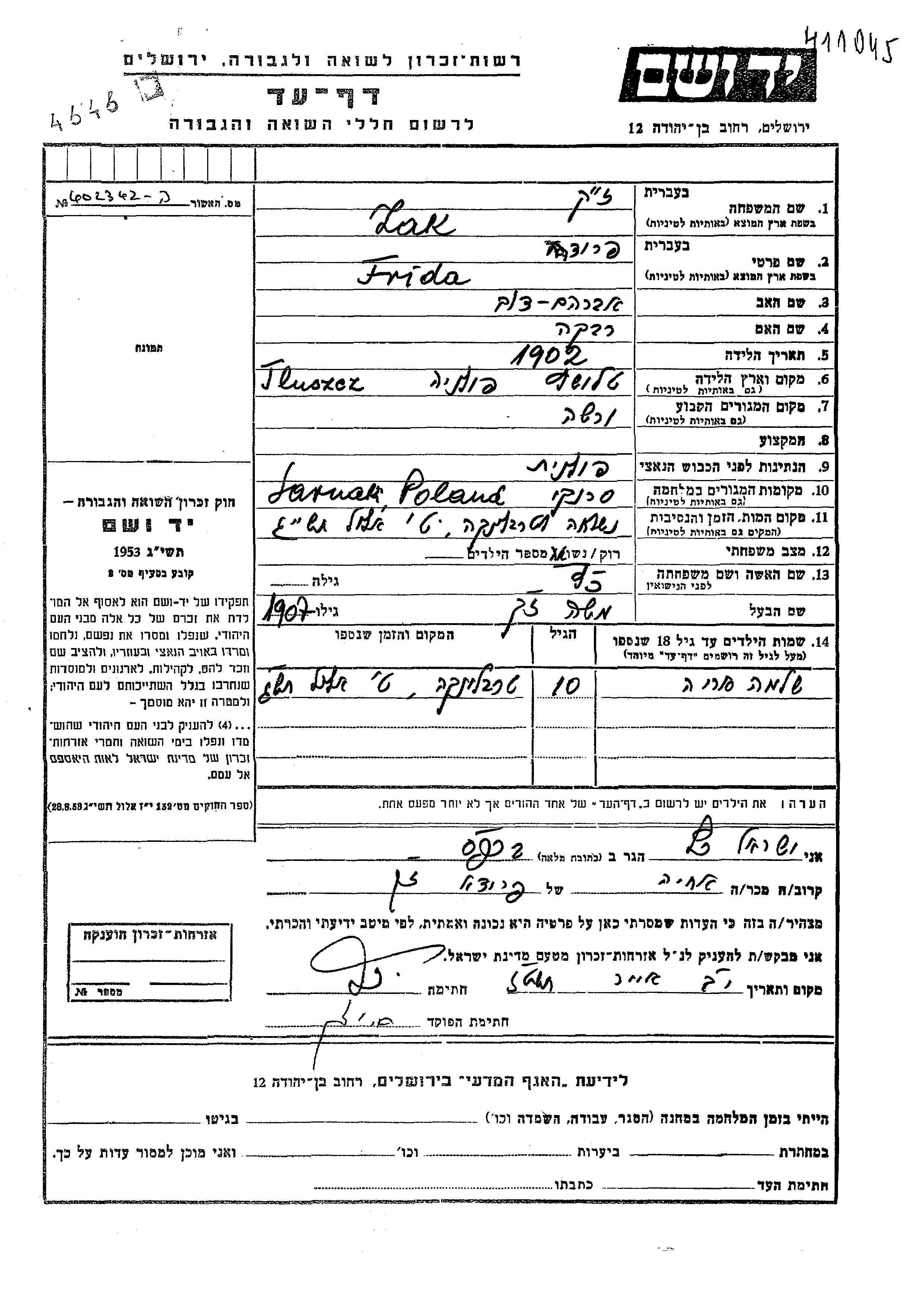 Frida Zak nee Katz was born in Tluszcz, Poland, 1902 to Avraham Dov and Rivka. She was married to Moshe. Prior to WWII she lived in Warszawa, Poland. During the war she was in Sarnak, Poland. Frida was murdered in the Shoah. Place of death: Treblinka, Poland, 09/09/1943.