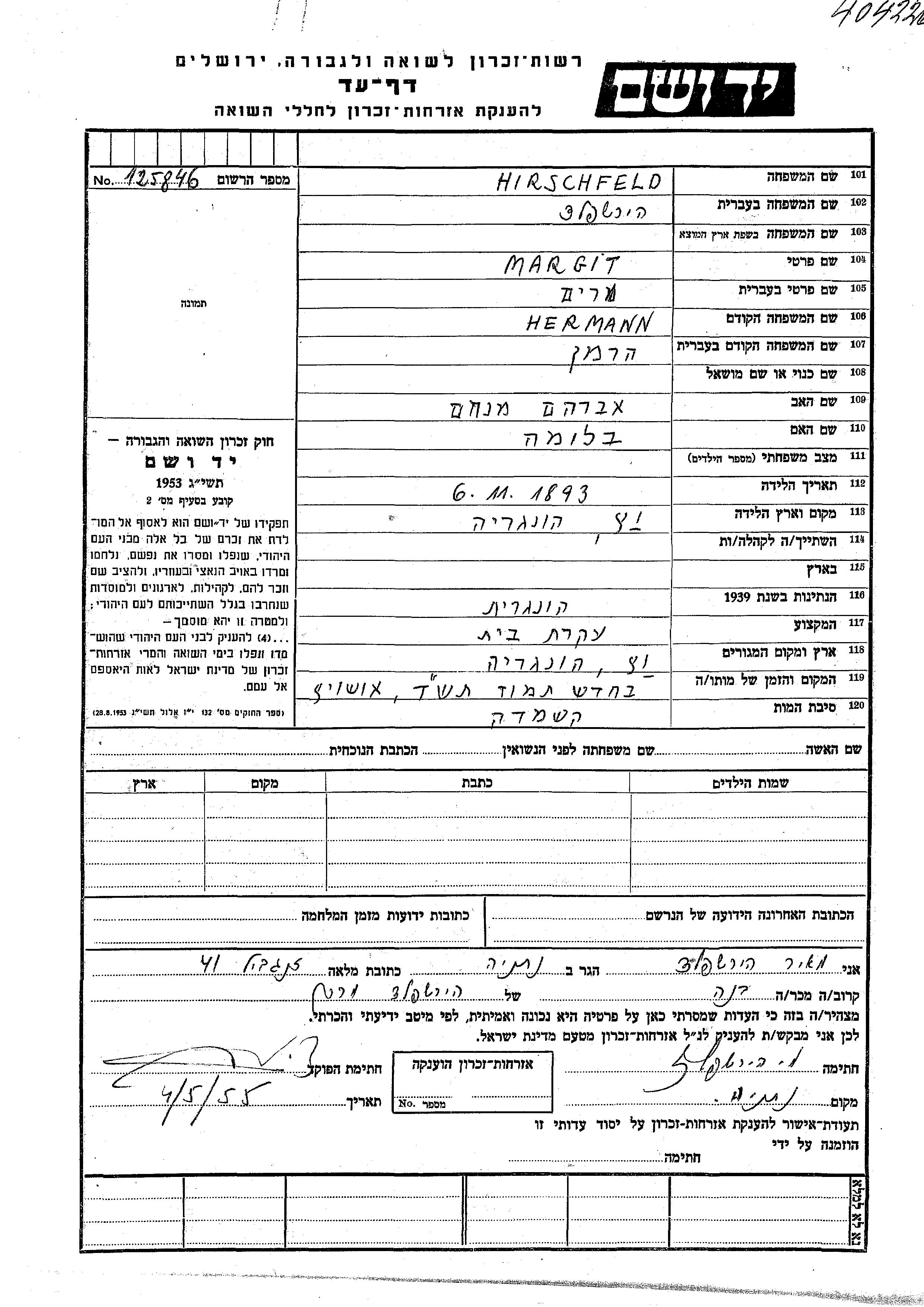Margit Miriam Hirschfeld nee Hermann was born in Hungary, 1893 to Avraham Menakhem and Bluma. She was a housewife. Margit Miriam was murdered in the Shoah. Place of death: Auschwitz, Poland, 06/1944.
