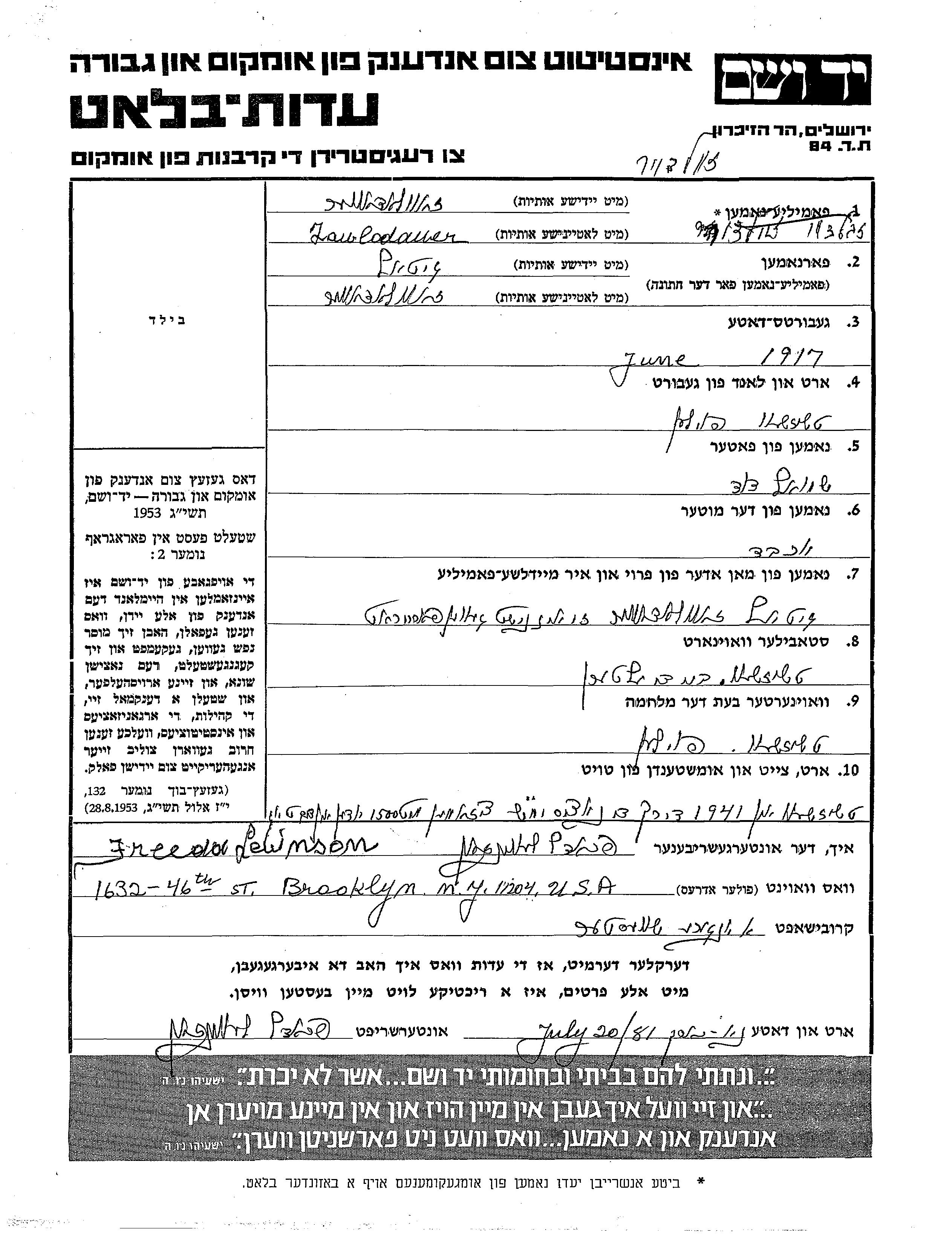 Gitel Zawlodawer was born in Czyzew, Poland, 1917 to Shmuel David and Yokheved. Prior to WWII she lived in Czyzew, Poland. During the war she was in Czyzew, Poland. Gitel was murdered in the Shoah. Place of death: Czyzew, Poland, 1941.