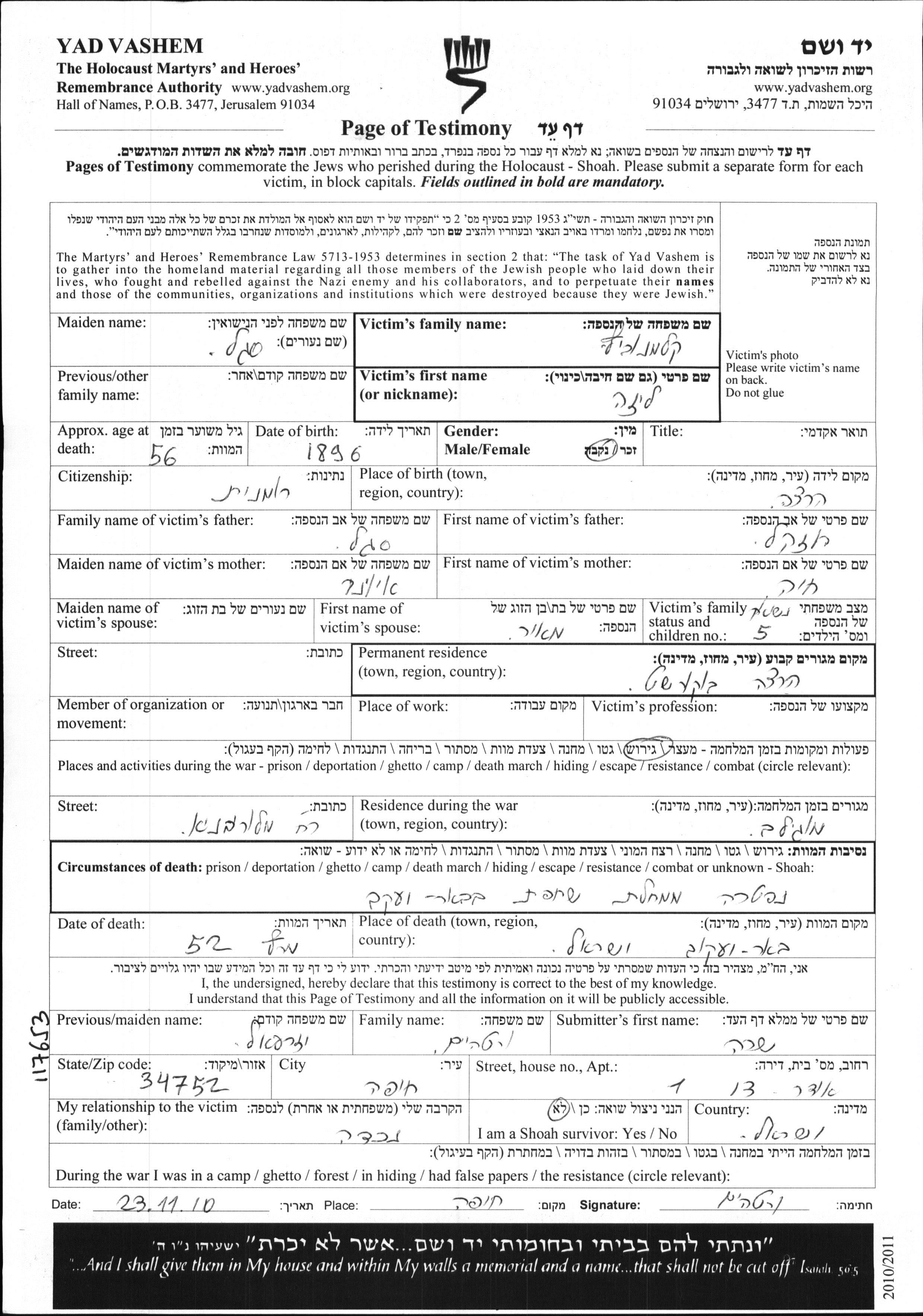 Search by last name of the submitter of the Page of Testimony, including diminutives or nicknames
